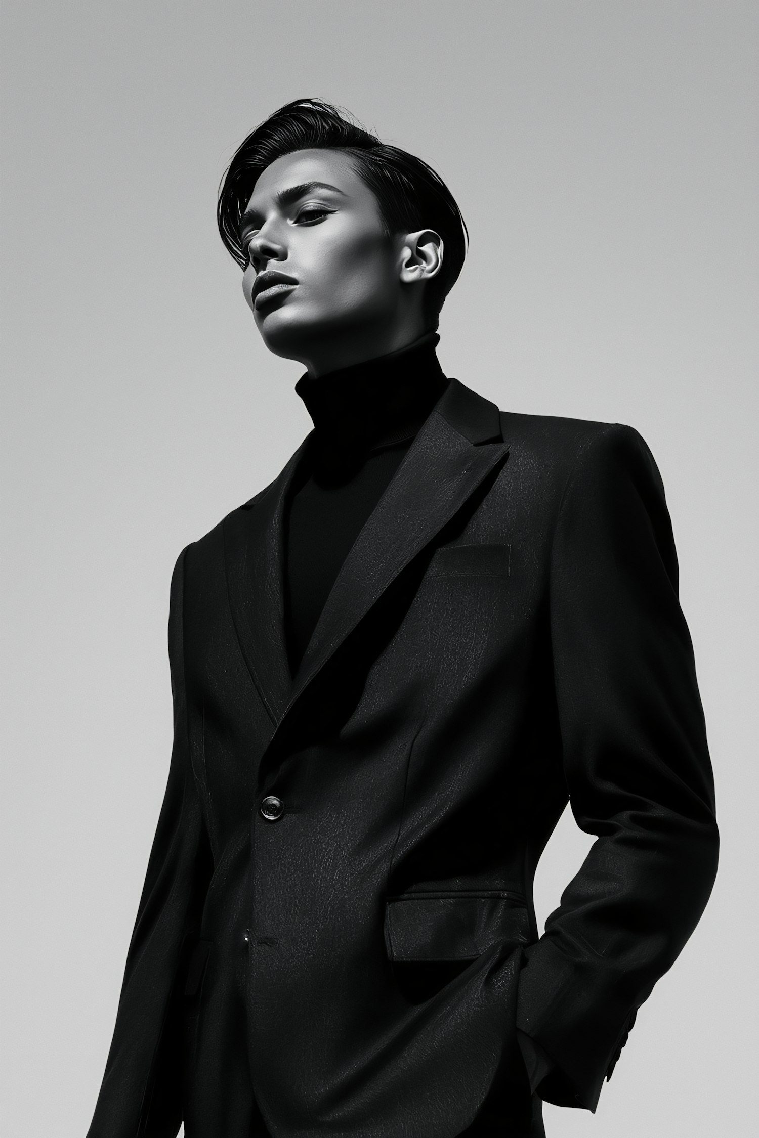 Monochrome portrait of a person in a sleek black suit and turtleneck, showcasing modern elegance and confidence.