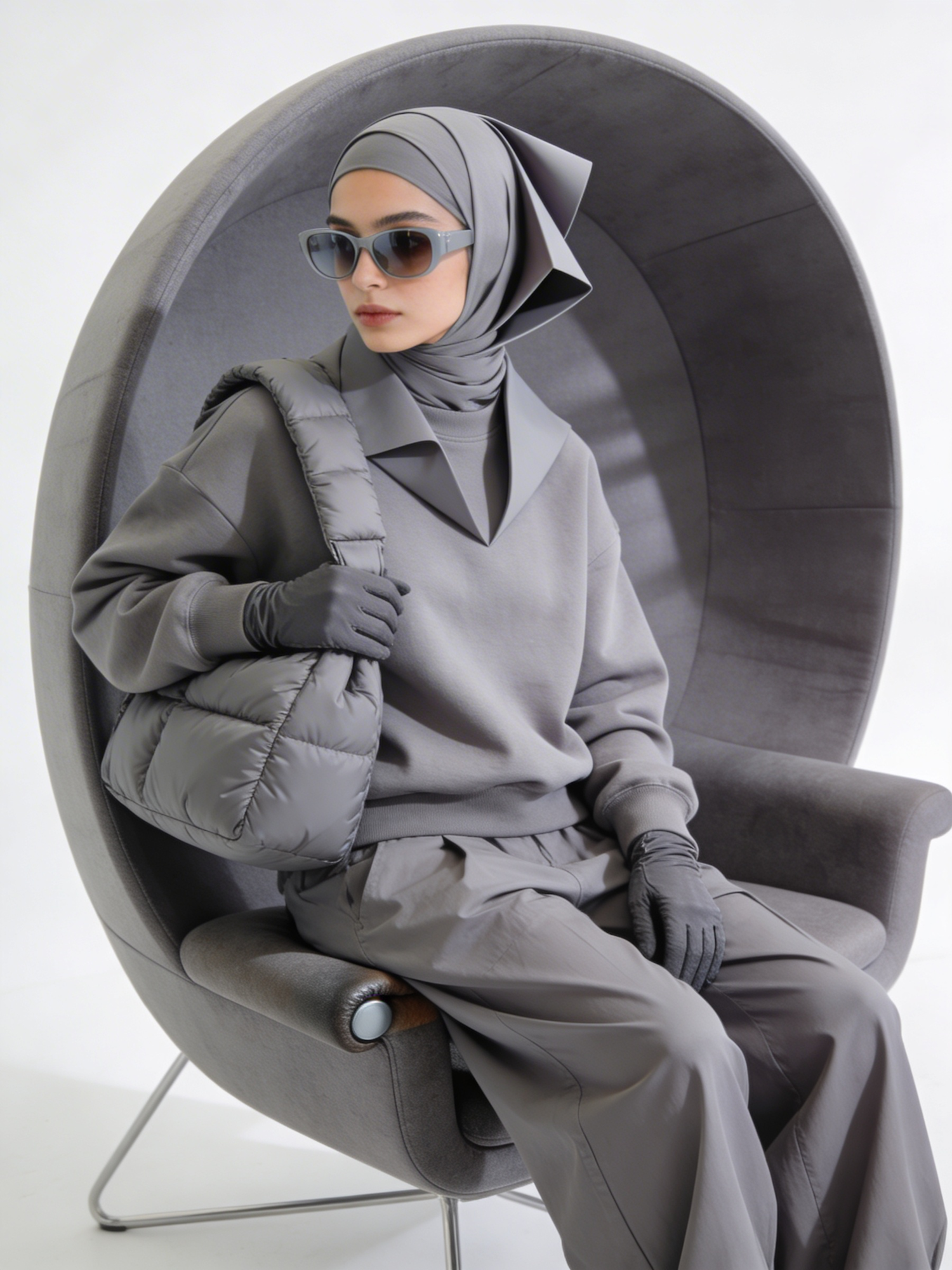 A high‑definition, minimalist editorial portrait. A stylish person sits on the armrest of a curved modern accent chair in matte slate‑grey upholstery. They wear a monochrome slate‑grey streetwear ensemble: oversized sweatshirt with crisp structure, wide‑leg trousers with a relaxed drop, and a sculptural hijab styled with modern folds. Accessories include smoked‑grey sunglasses, fitted gloves, and a padded streetwear‑style shoulder bag. Soft natural daylight creates a calm, architectural mood against a clean white background. No logos, no watermarks, no extra text.