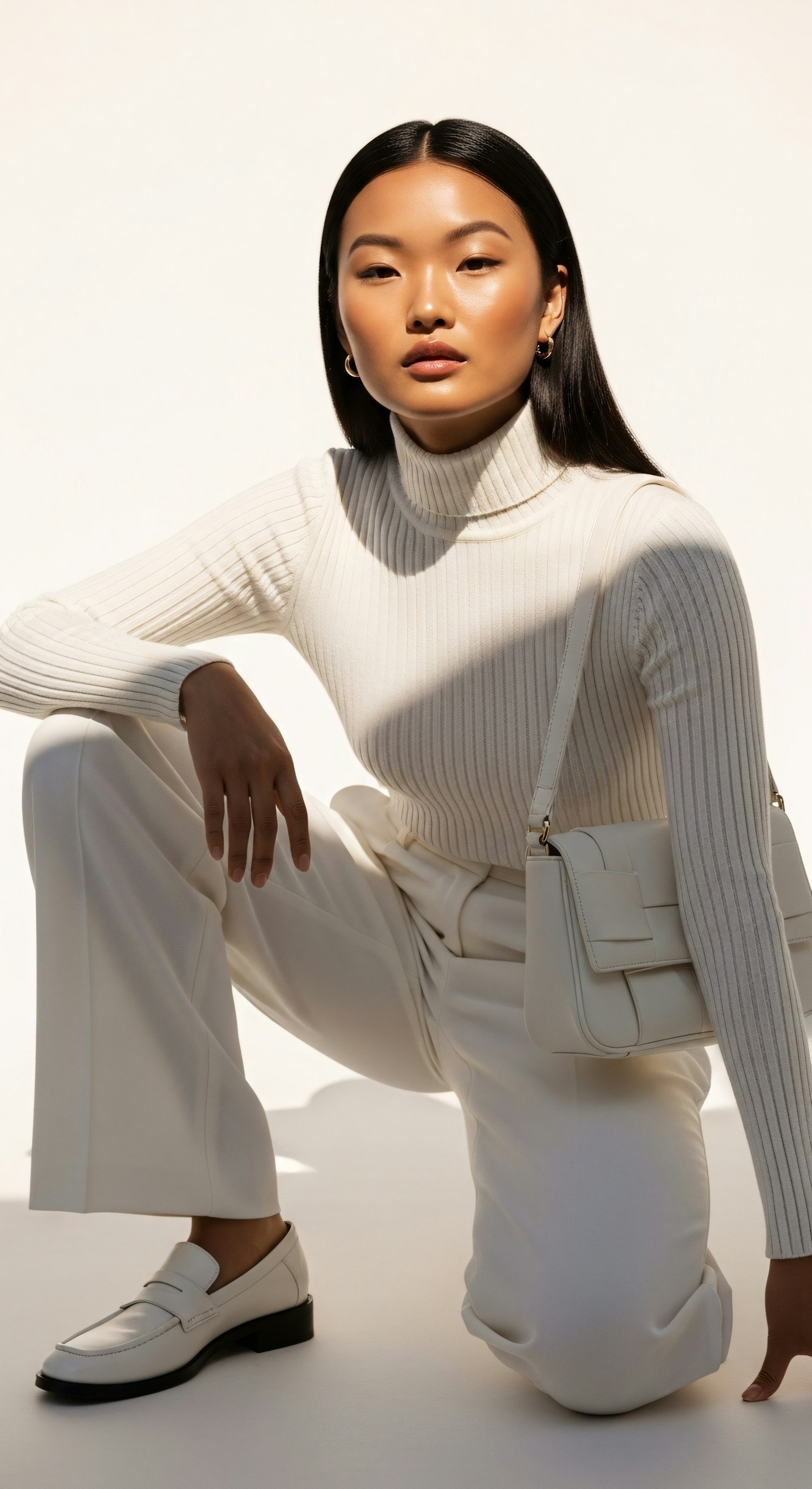 A stylish individual in a monochromatic white outfit poses confidently, showcasing modern fashion with sleek accessories.