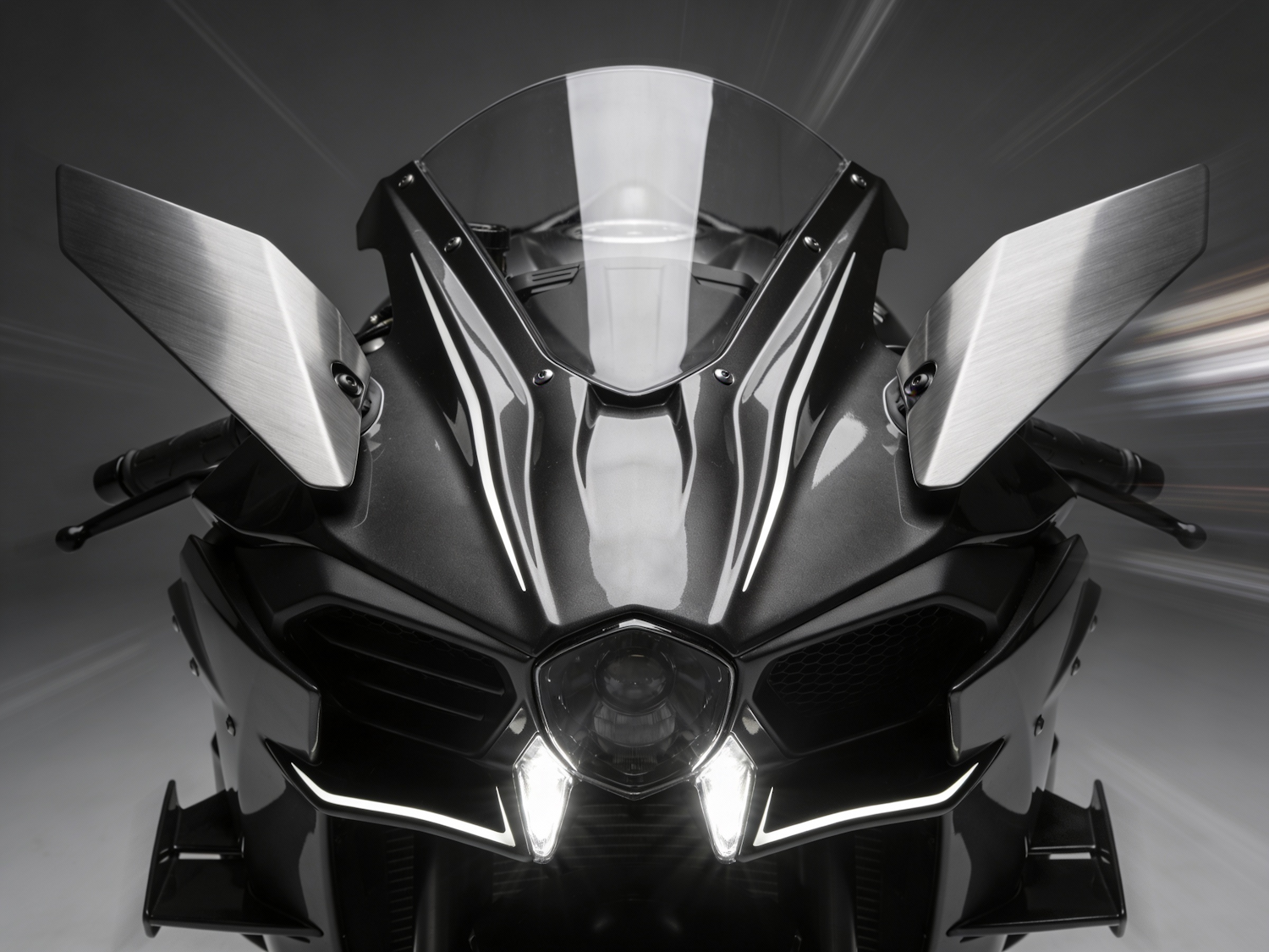 Close-up of a futuristic motorcycle front with sharp design, brushed aluminum winglets, and LED headlights, emphasizing speed and style.