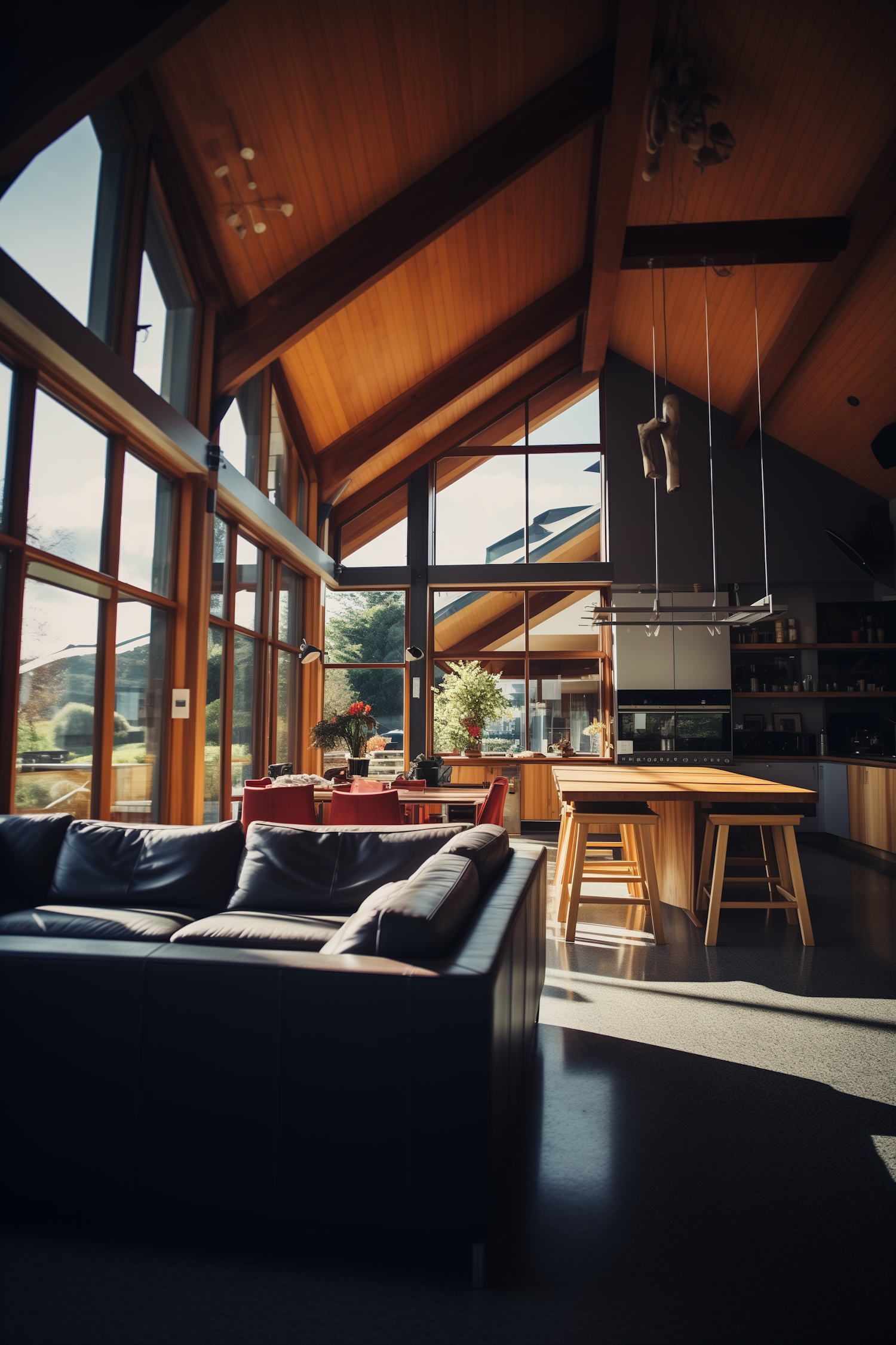Modern living space with high wooden ceilings, large windows, black leather sofa, and a wooden dining area with red chairs.