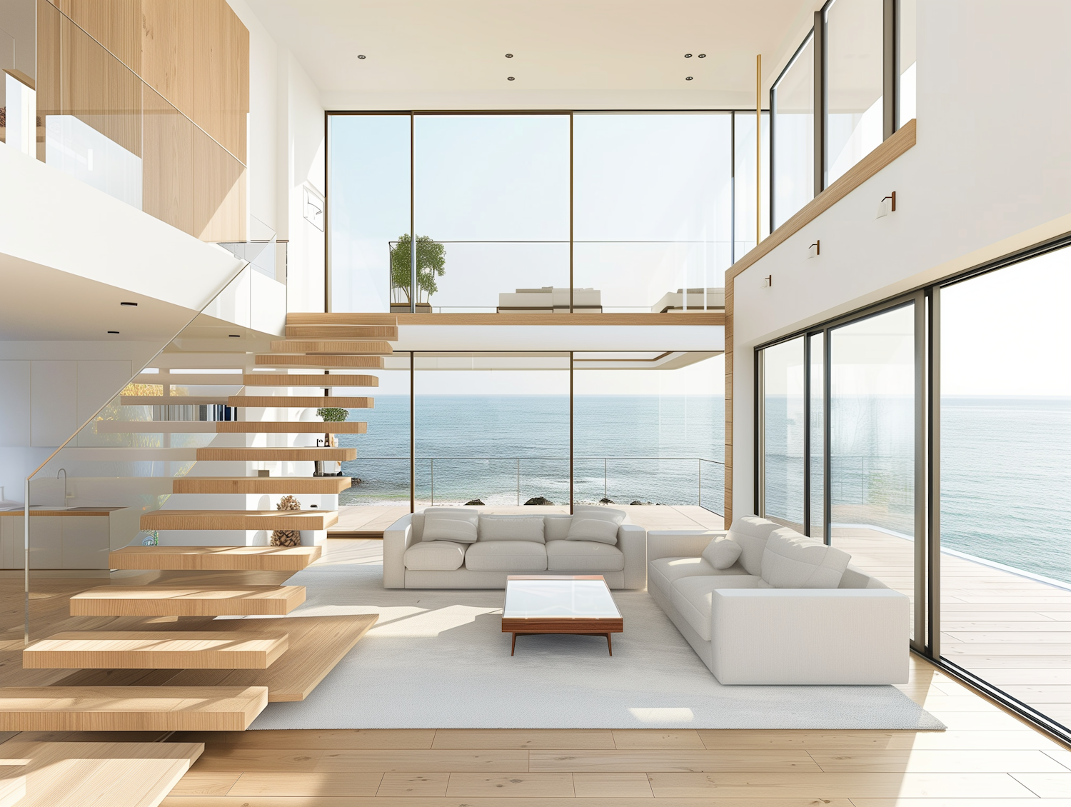 Modern living room with ocean view, featuring large windows, floating staircase, white sofa, and wooden accents.