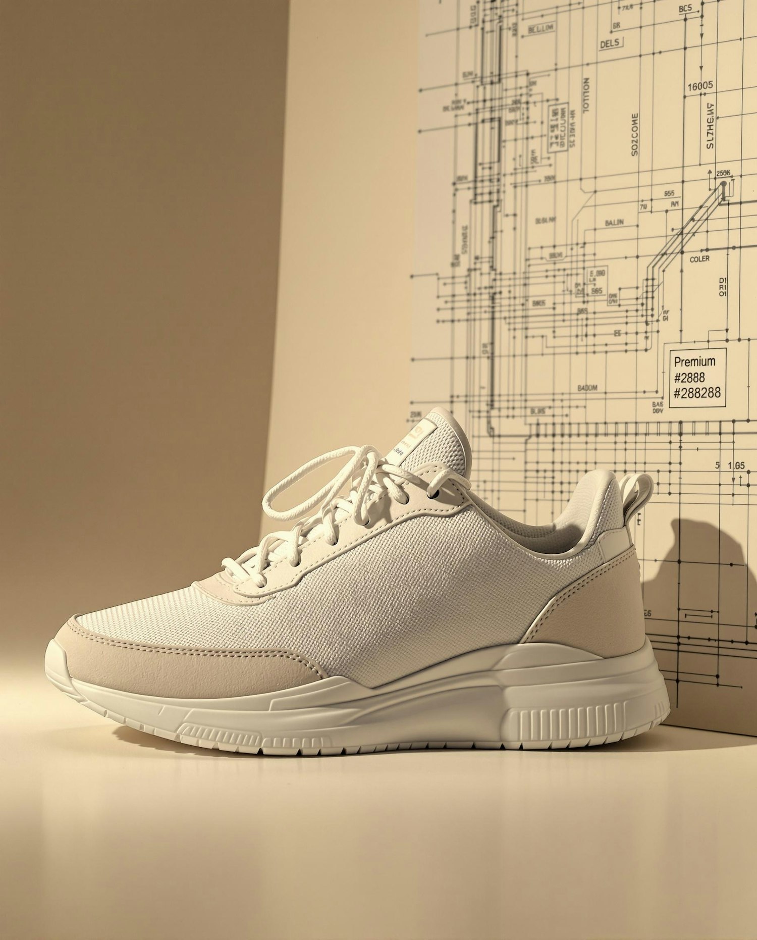 Minimalist off-white sneaker with textured fabric and smooth overlays, set against a technical blueprint background for a modern vibe.