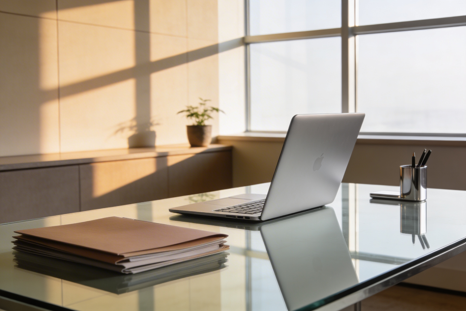 Modern professional office with a clean glass desk, open MacBook, stacked matte folders, warm neutral tones, soft window light casting long shadows, minimal decor, architectural photography style