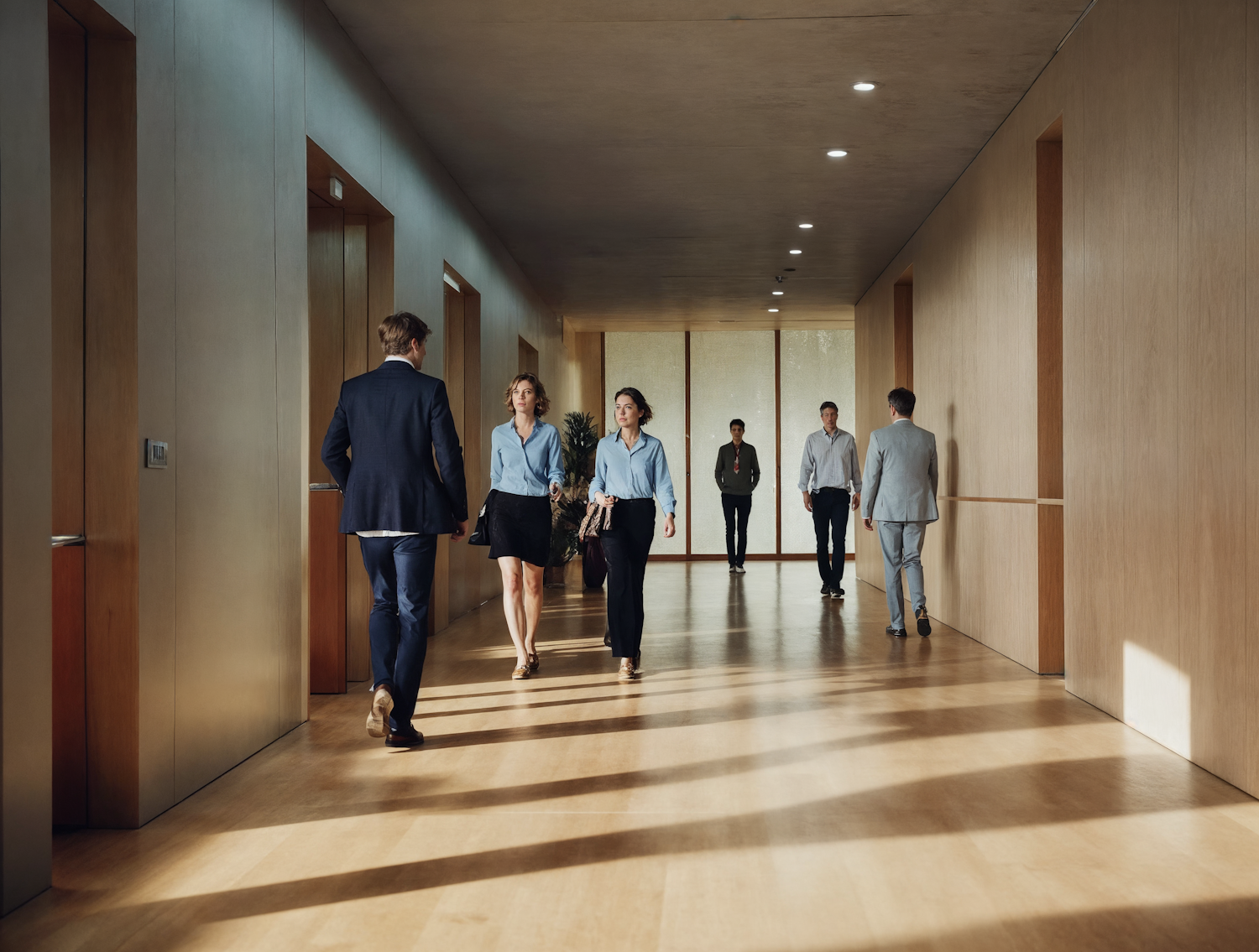 Modern office hallway with professionals walking, dressed in business attire, under natural light and minimalist wooden interiors.