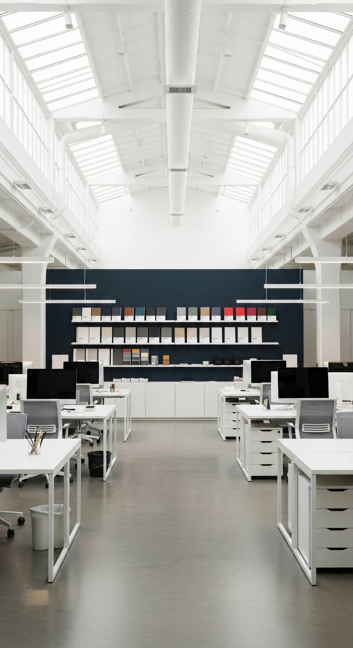 Bright, modern office with white desks, a dark blue accent wall, and skylights creating a clean, minimalist workspace.