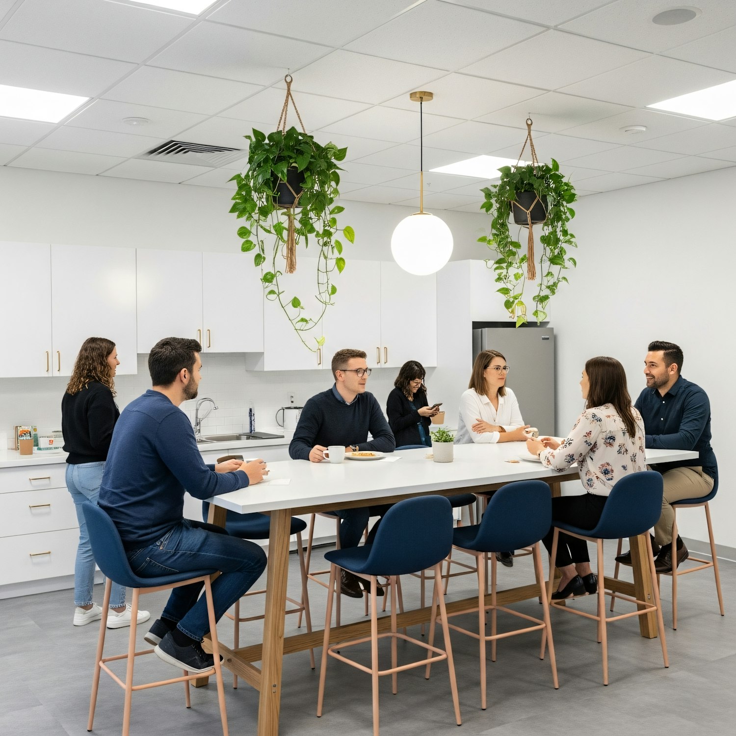 Bright office kitchen with colleagues chatting around a modern table, featuring hanging plants and a relaxed, collaborative vibe.