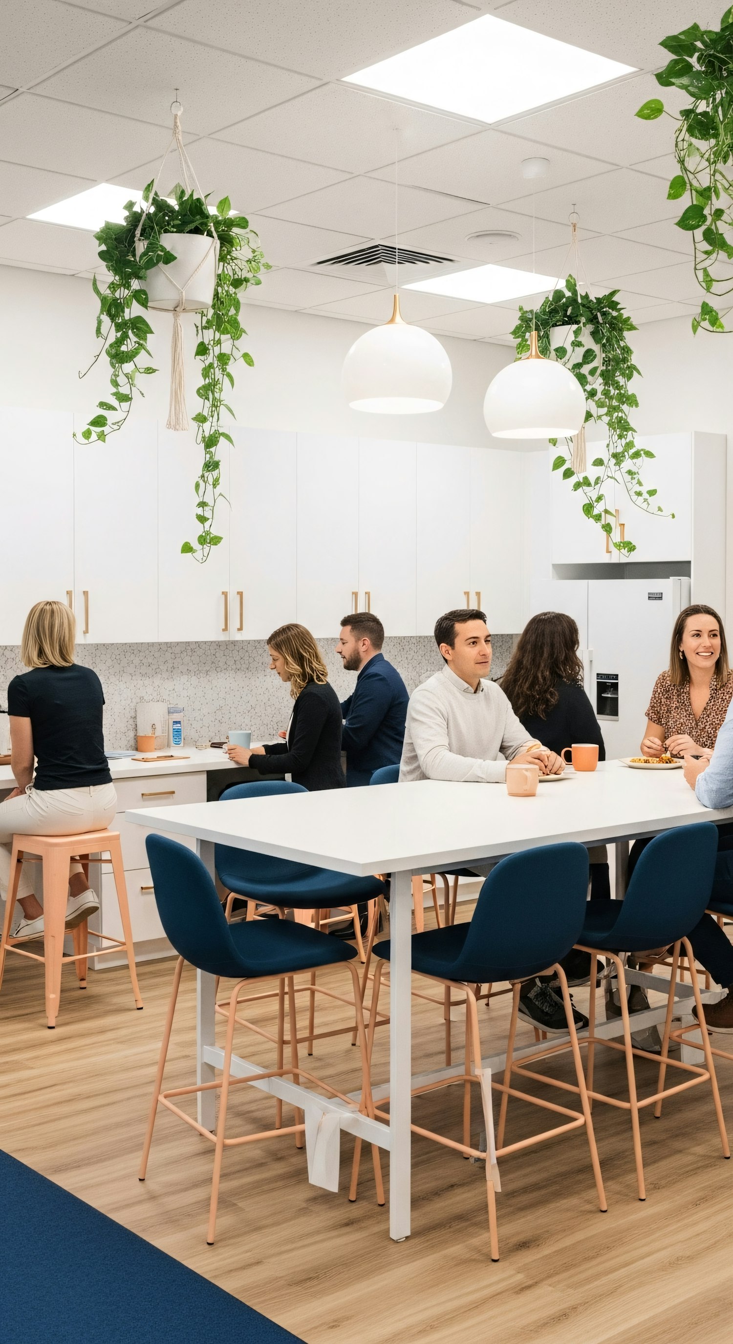 Bright office kitchen with modern decor, hanging plants, and people enjoying coffee and conversation at a communal table.