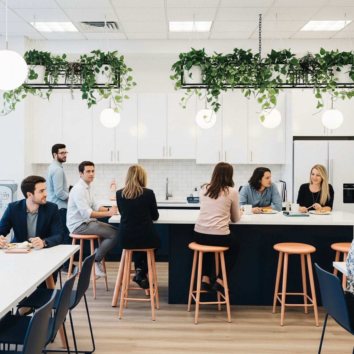 Bright office kitchen with people chatting and enjoying snacks around a modern island, featuring hanging plants and sleek decor.