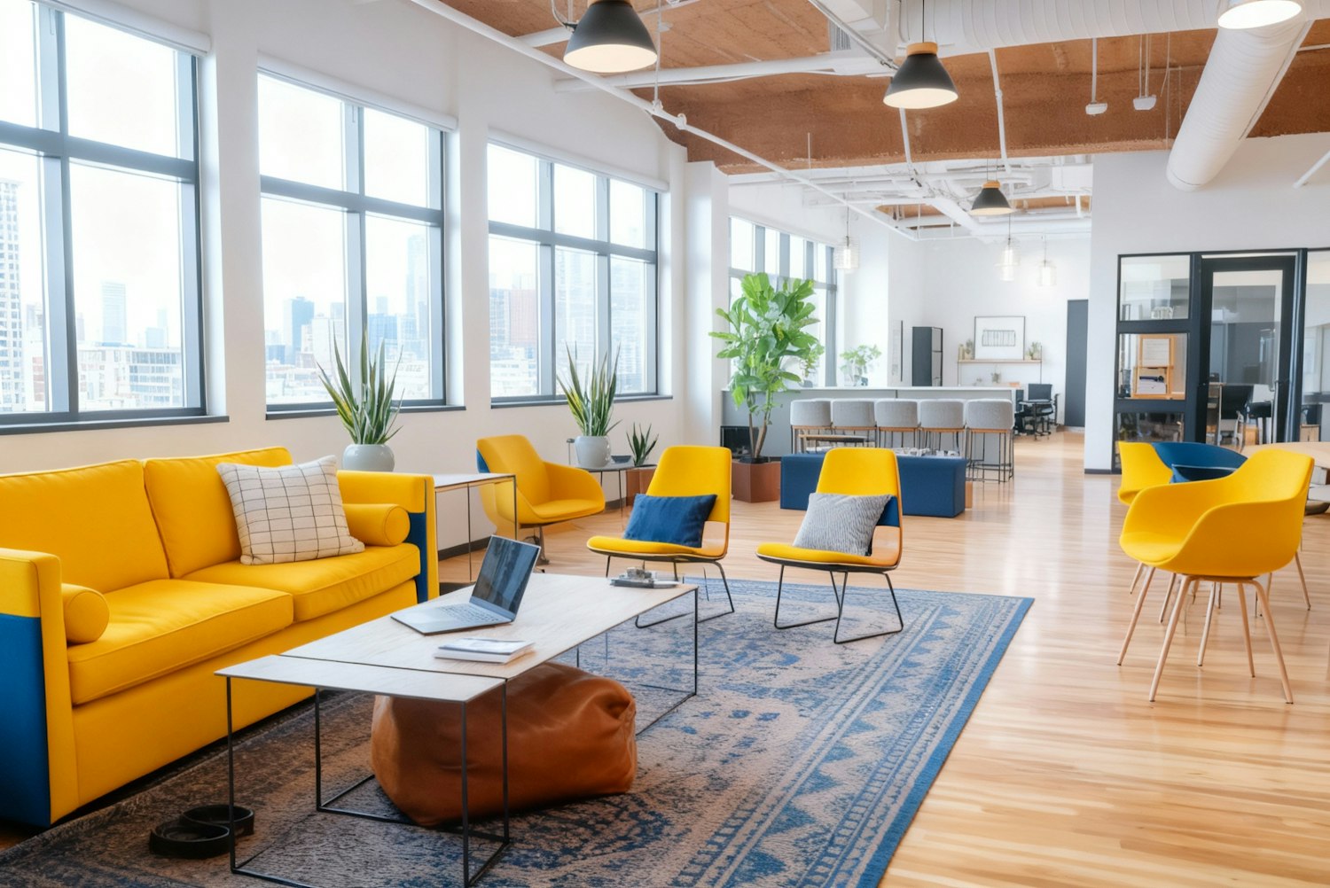 Bright and modern office lounge with yellow furniture, natural light, and a city view, perfect for collaborative and casual work.