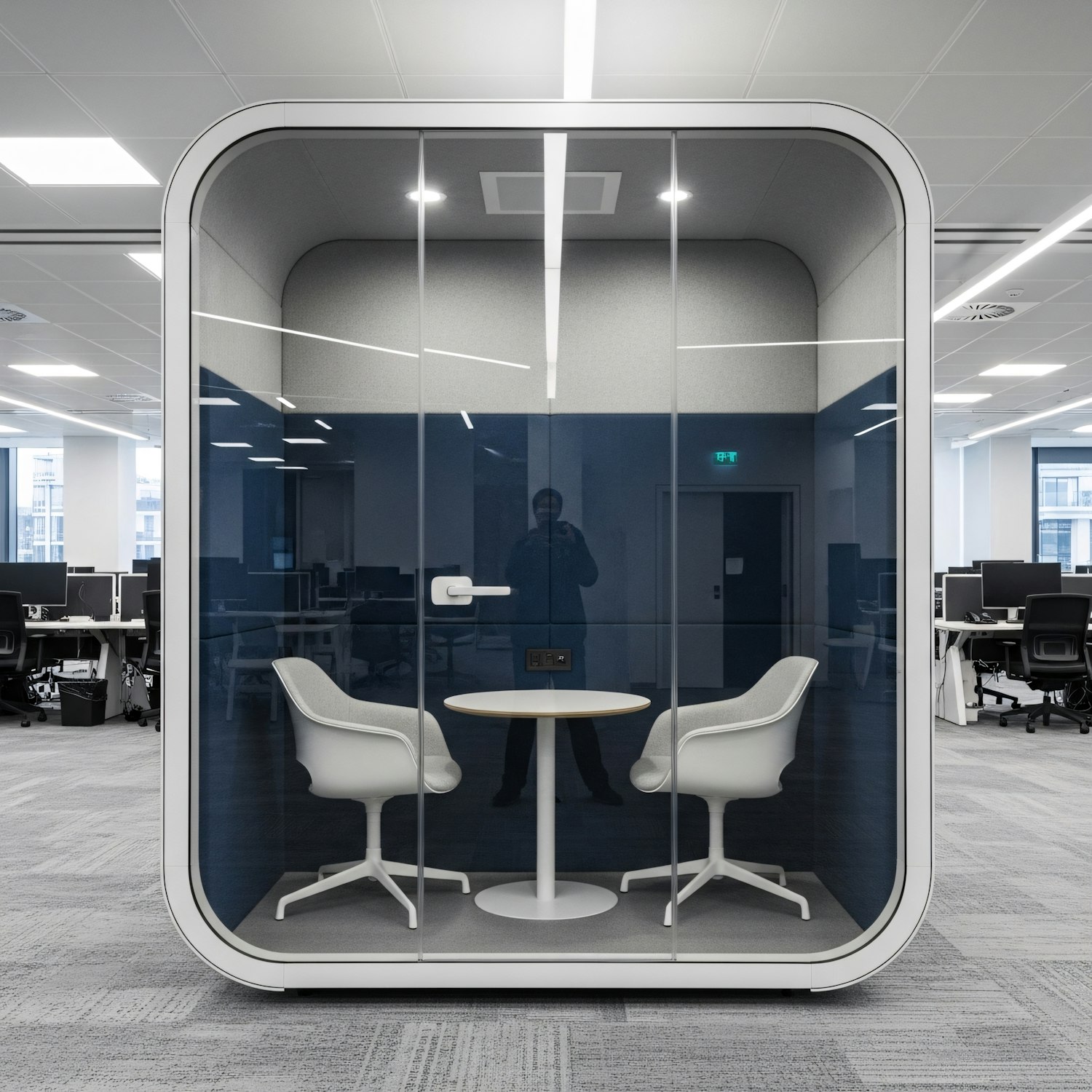 Modern office pod with glass walls, two white chairs, and a round table, set in a sleek open-plan workspace.