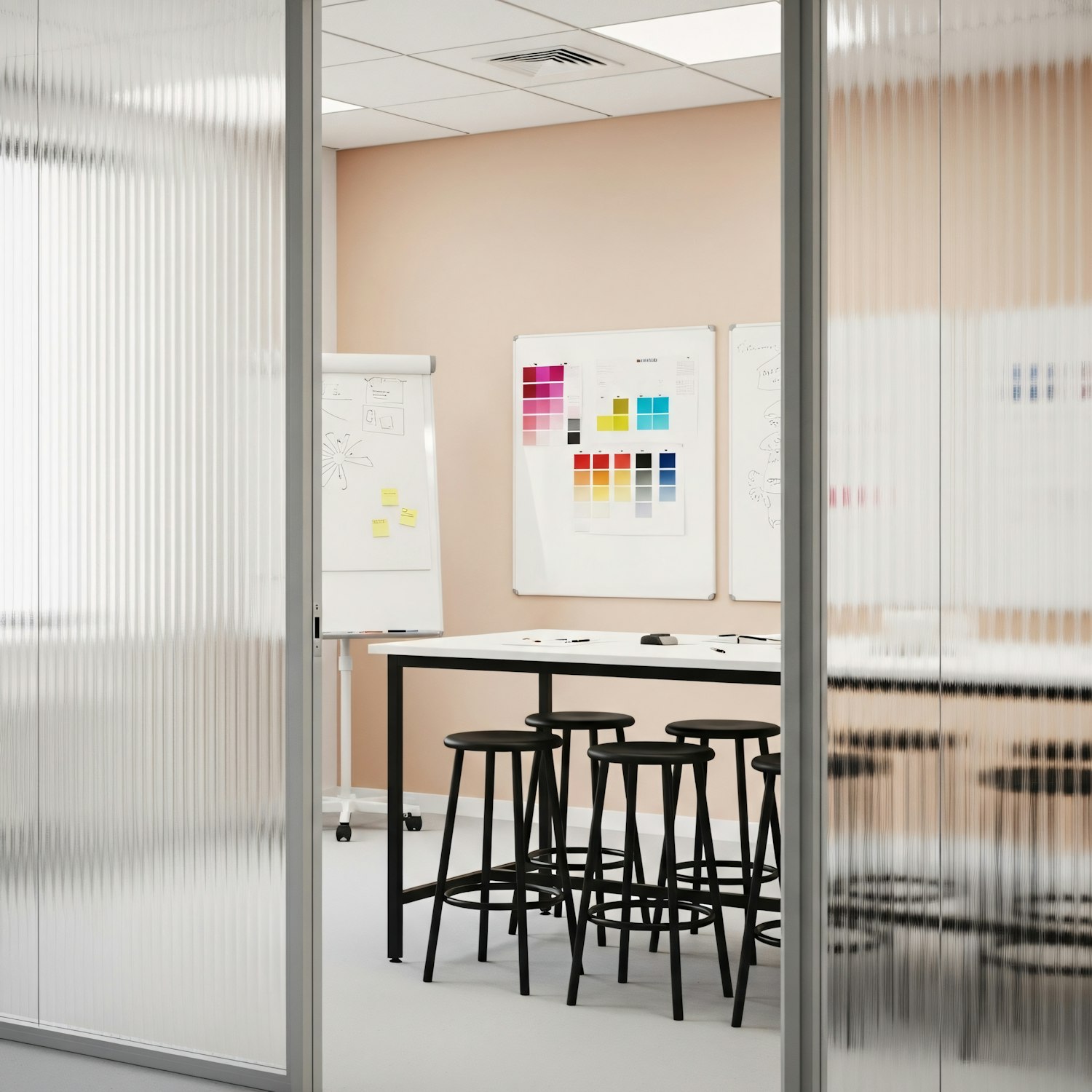 Modern office meeting room with a high table, black stools, and whiteboards displaying color swatches and sketches, enclosed by frosted glass.