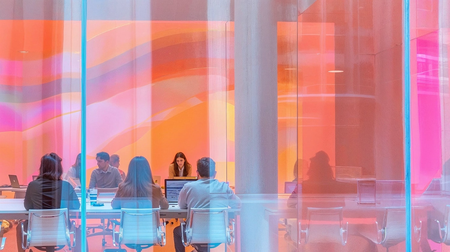 Vibrant office meeting with diverse team, colorful abstract mural, and modern glass walls. Collaborative and creative workspace.