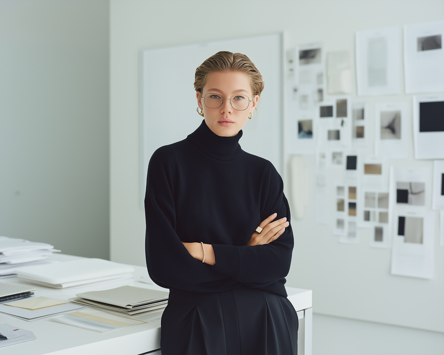 Confident woman in a black turtleneck and glasses in a minimalist office with design sketches on the wall. Modern and professional vibe.