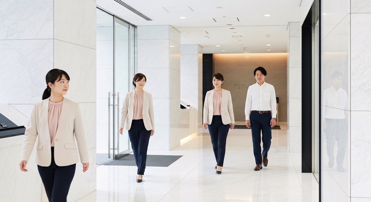 Four professionals walking through a sleek, modern office hallway with marble floors and bright lighting, exuding a professional vibe.