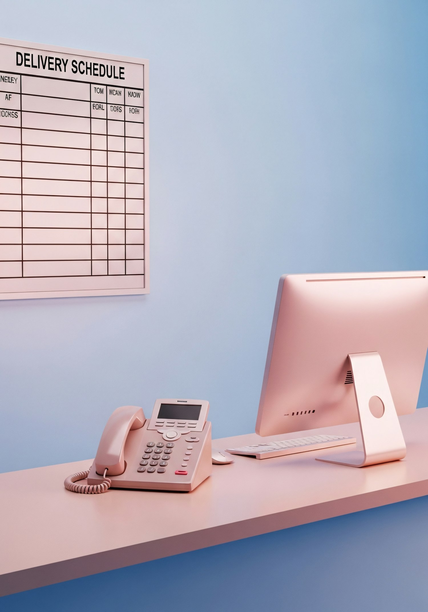A pastel-themed office desk setup with a pink computer, phone, and a delivery schedule board on a blue background.