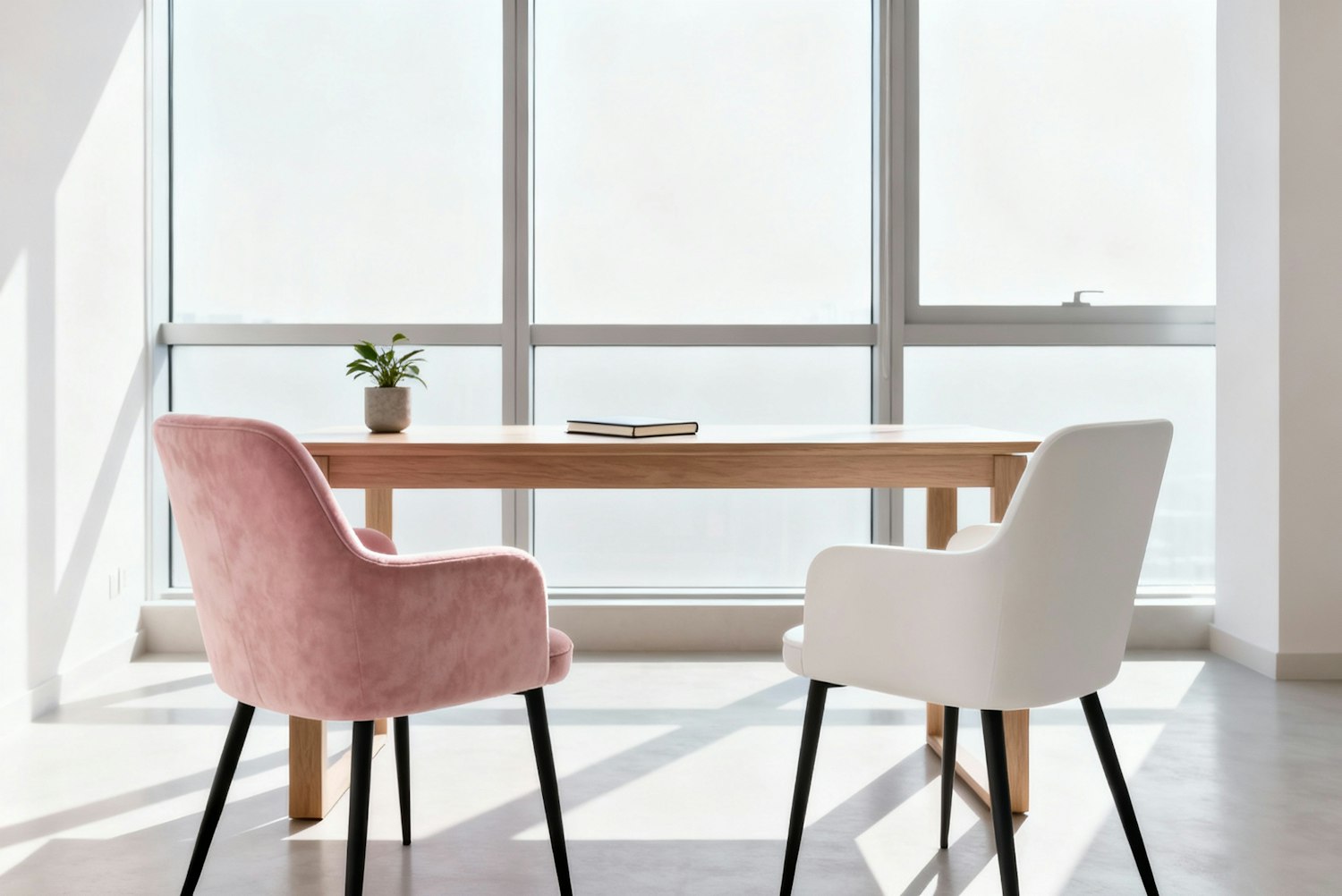 A bright, minimalist office with a wooden desk, pink accent chair, and natural light streaming through large windows. There are two chairs facing each other, as if set up for a therapist session.