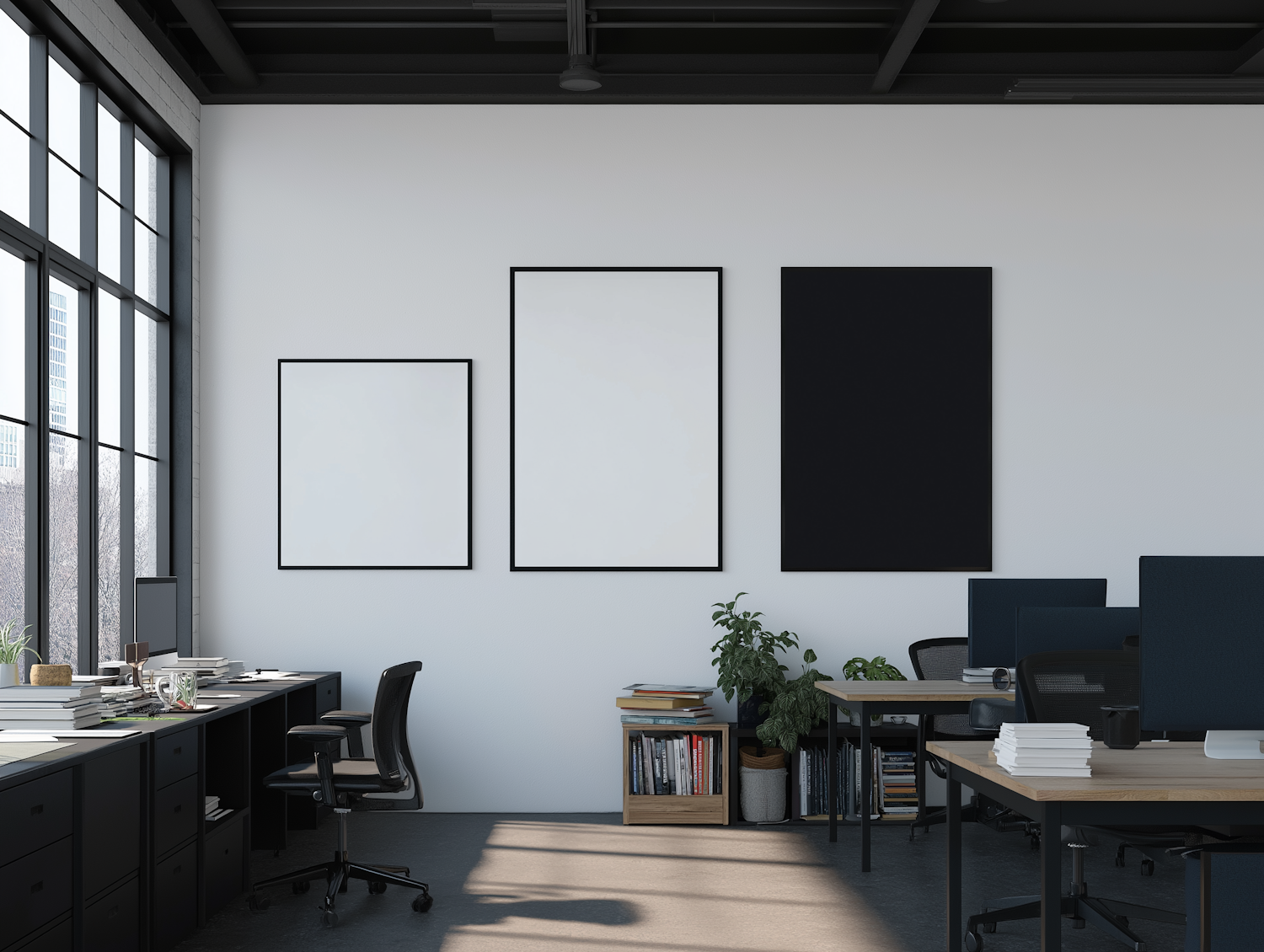 Modern office with minimalist decor, large windows, framed wall art, and organized desks with plants and books for a professional vibe.