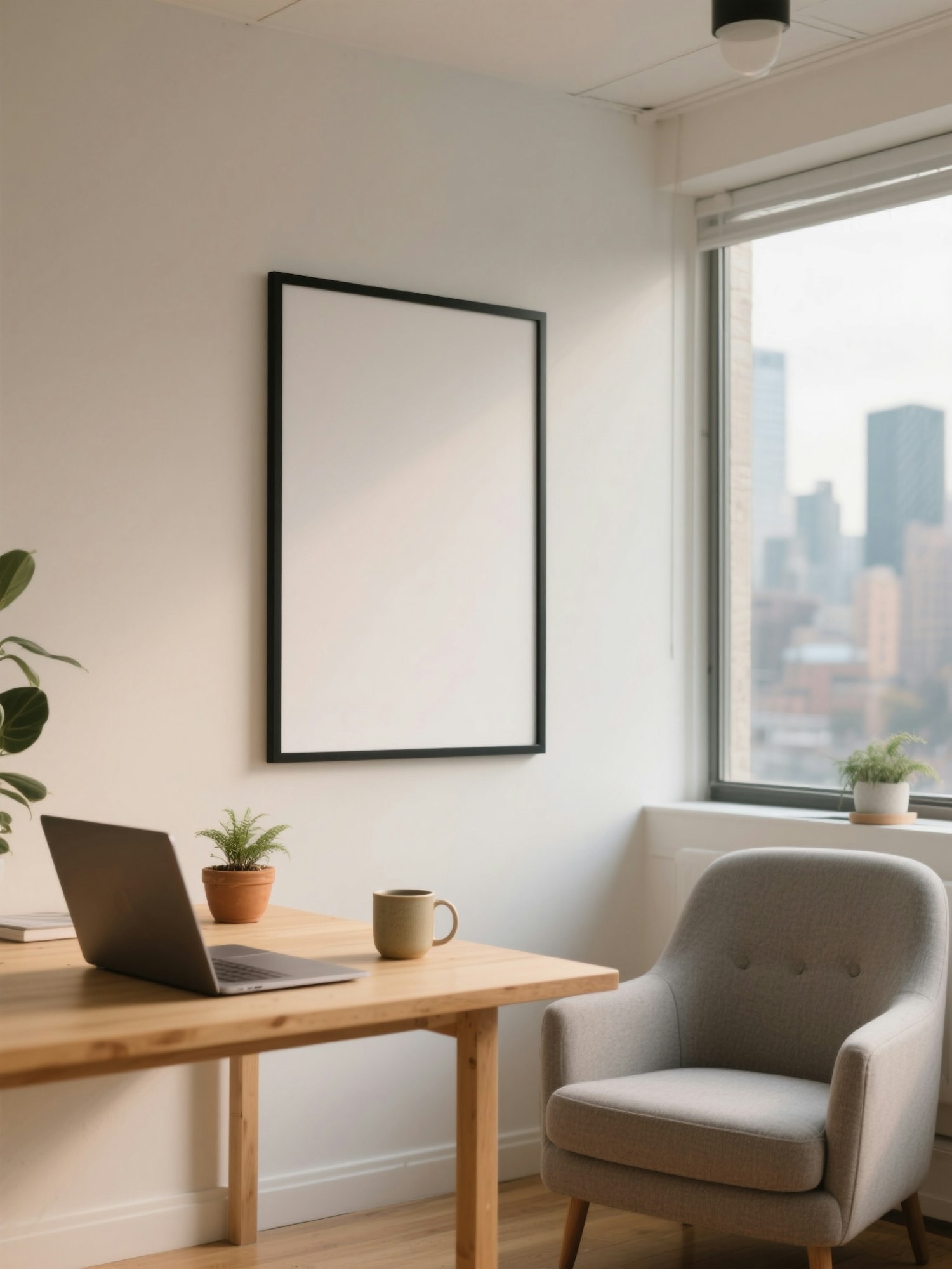single blank poster in a warm and casual modern office space, for mock up purposes