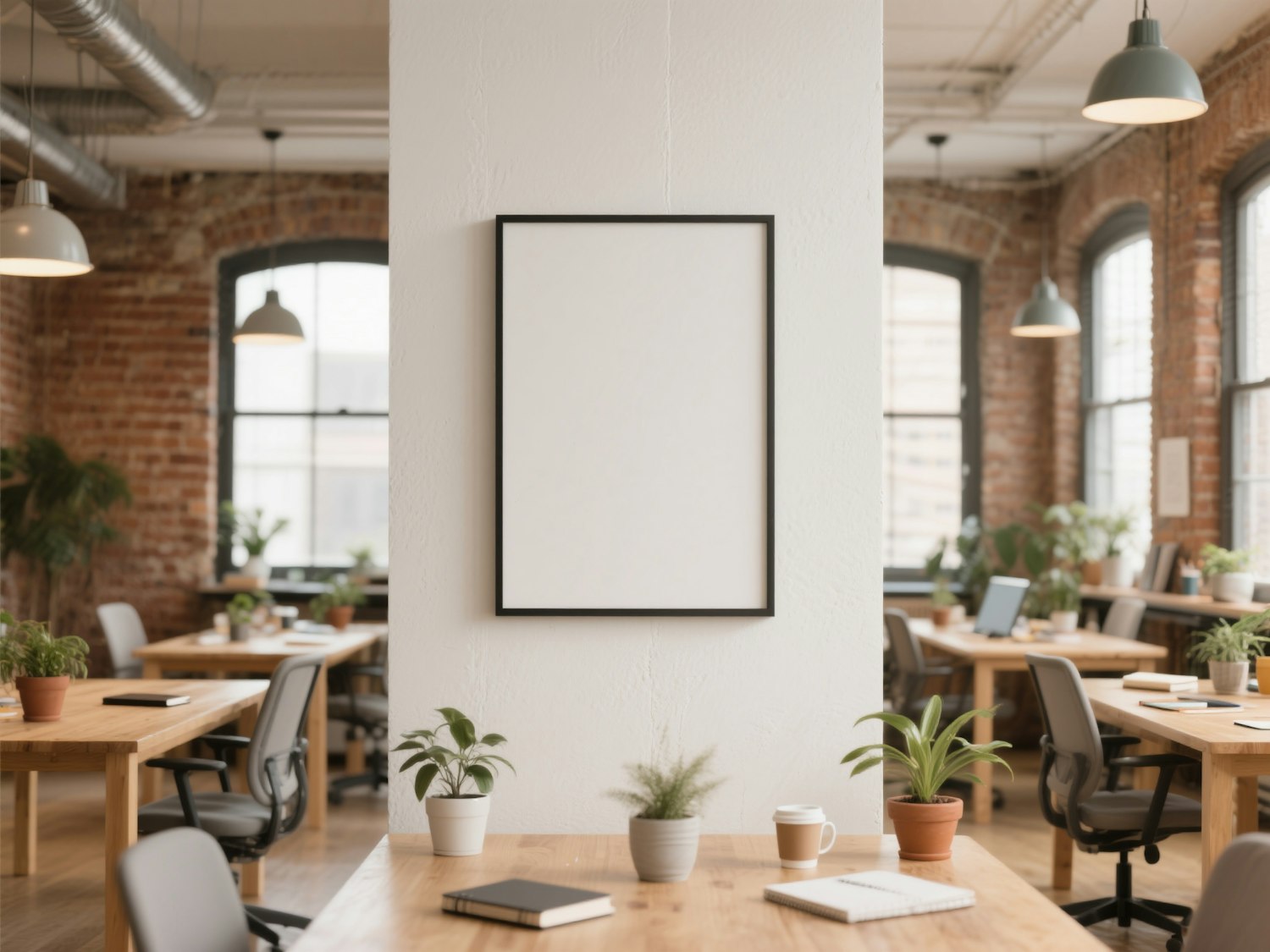 Bright industrial-style office with exposed brick, wooden desks, potted plants, and a blank framed poster on a central white pillar.