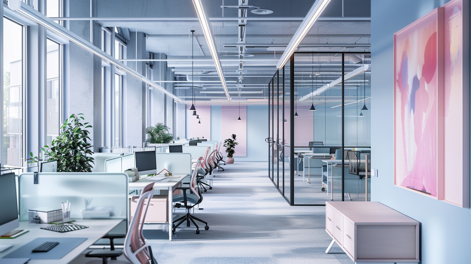 Bright, modern office with pastel tones, ergonomic chairs, glass meeting room, and natural light from floor-to-ceiling windows.
