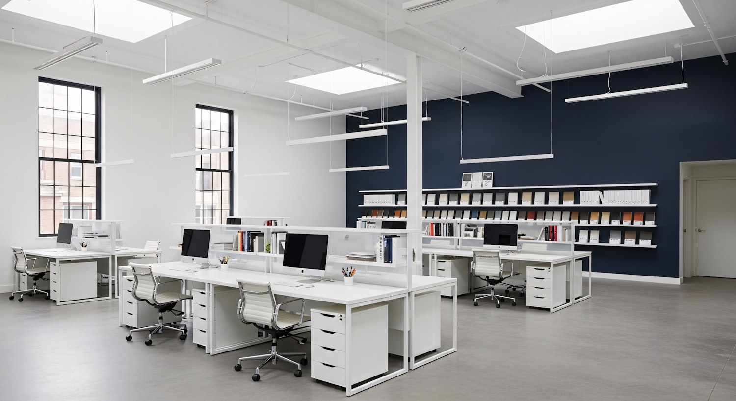 Bright, modern office with white desks, navy accent wall, and large windows. Minimalist design with ergonomic chairs and organized shelves.