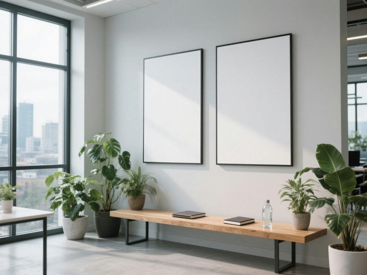Bright office space with blank frames, a wooden bench, and lush potted plants, creating a modern and inviting atmosphere.