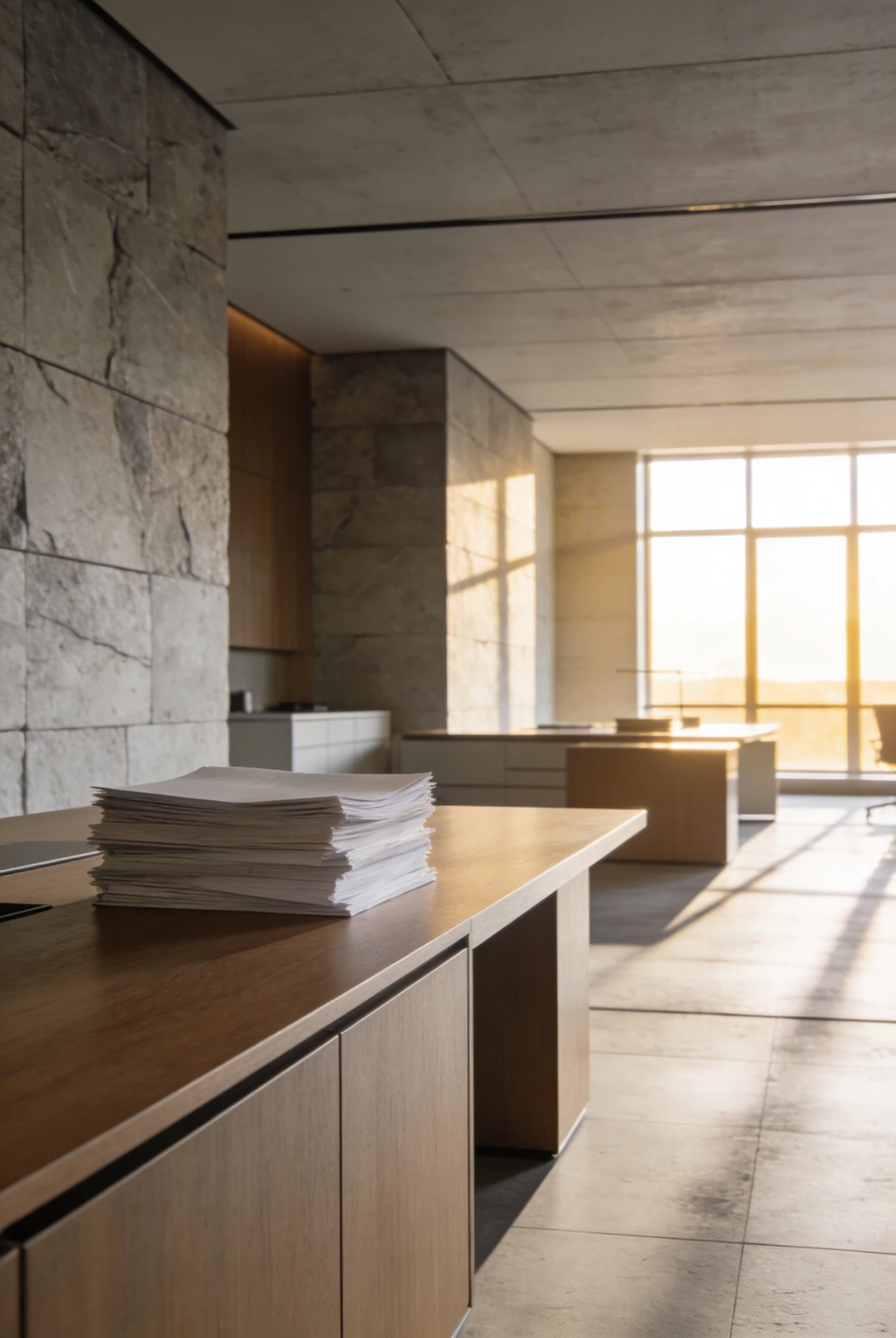 Modern professional office flooded with bright golden hour light, stone and wood surfaces, neatly stacked paper folders, soft diffused daylight, muted tonal palette, bright and clean, photorealistic, no people, architectural photography, --style raw --ar 2:3