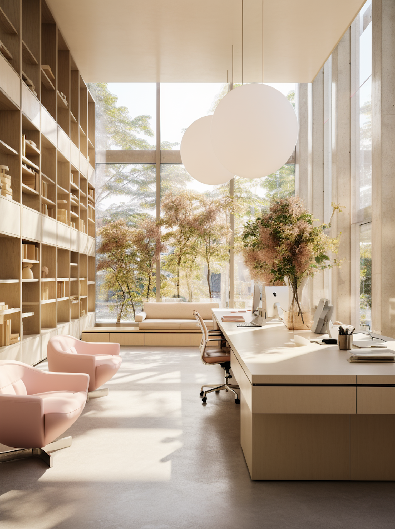 Modern office with large windows, pink chairs, and light wood decor. Natural light and greenery create a serene workspace.