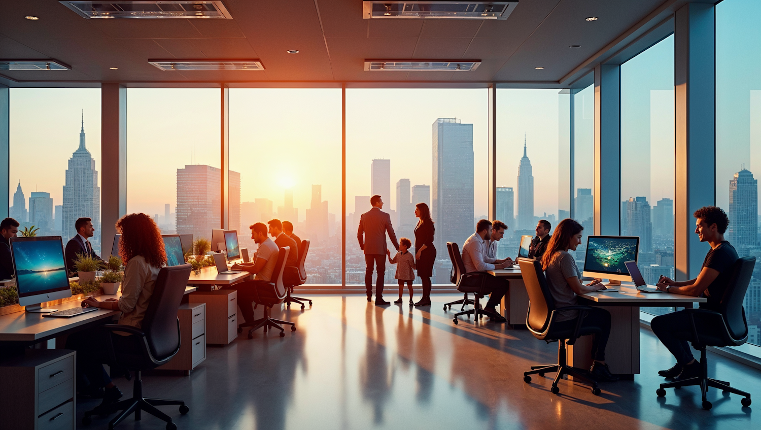 Modern office with city skyline view at sunset, diverse team working at desks, and a family moment in the center.