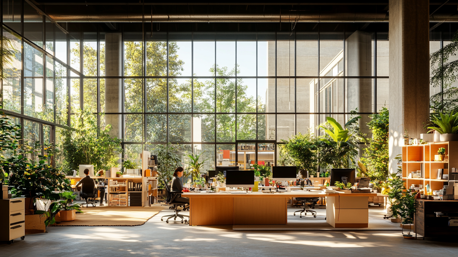 Modern office with large windows, lush greenery, and two people working at desks. Bright, serene, and eco-friendly workspace.