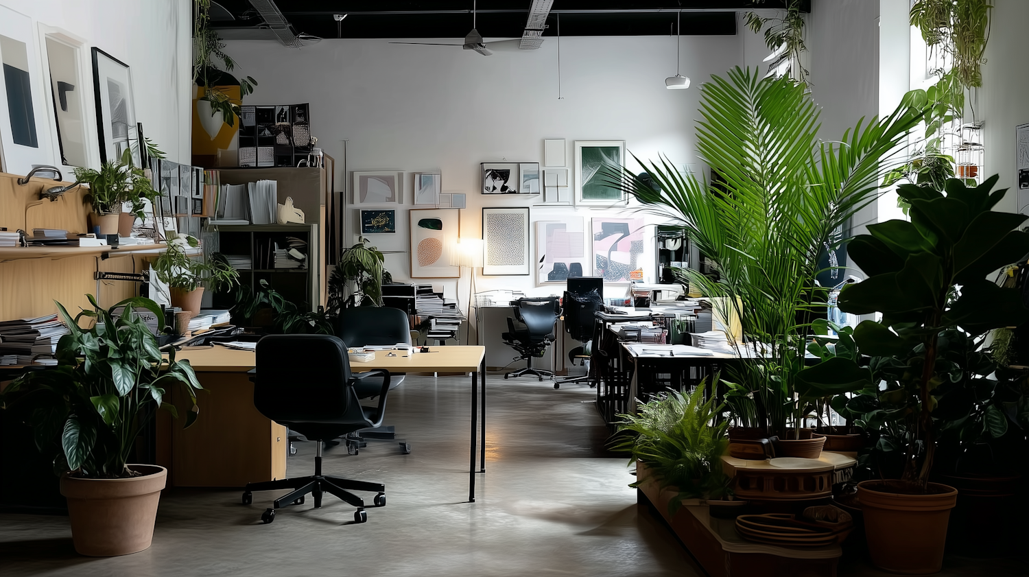 A stylish office with lush greenery, modern furniture, and artistic decor, creating a cozy and creative workspace.