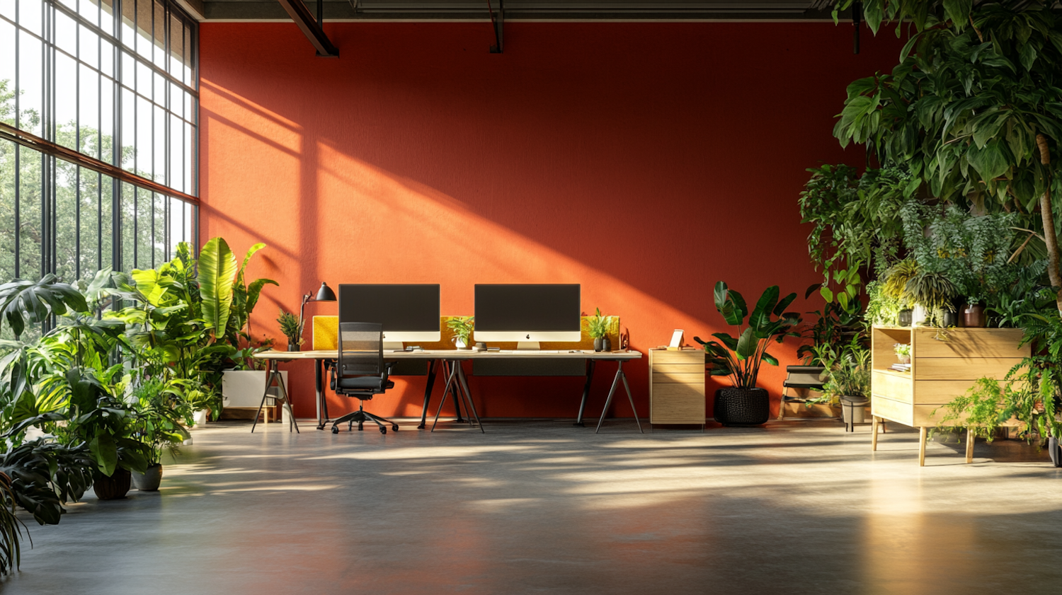 Modern office with vibrant red wall, lush green plants, and sleek desk setup with dual monitors. Natural light enhances the space.