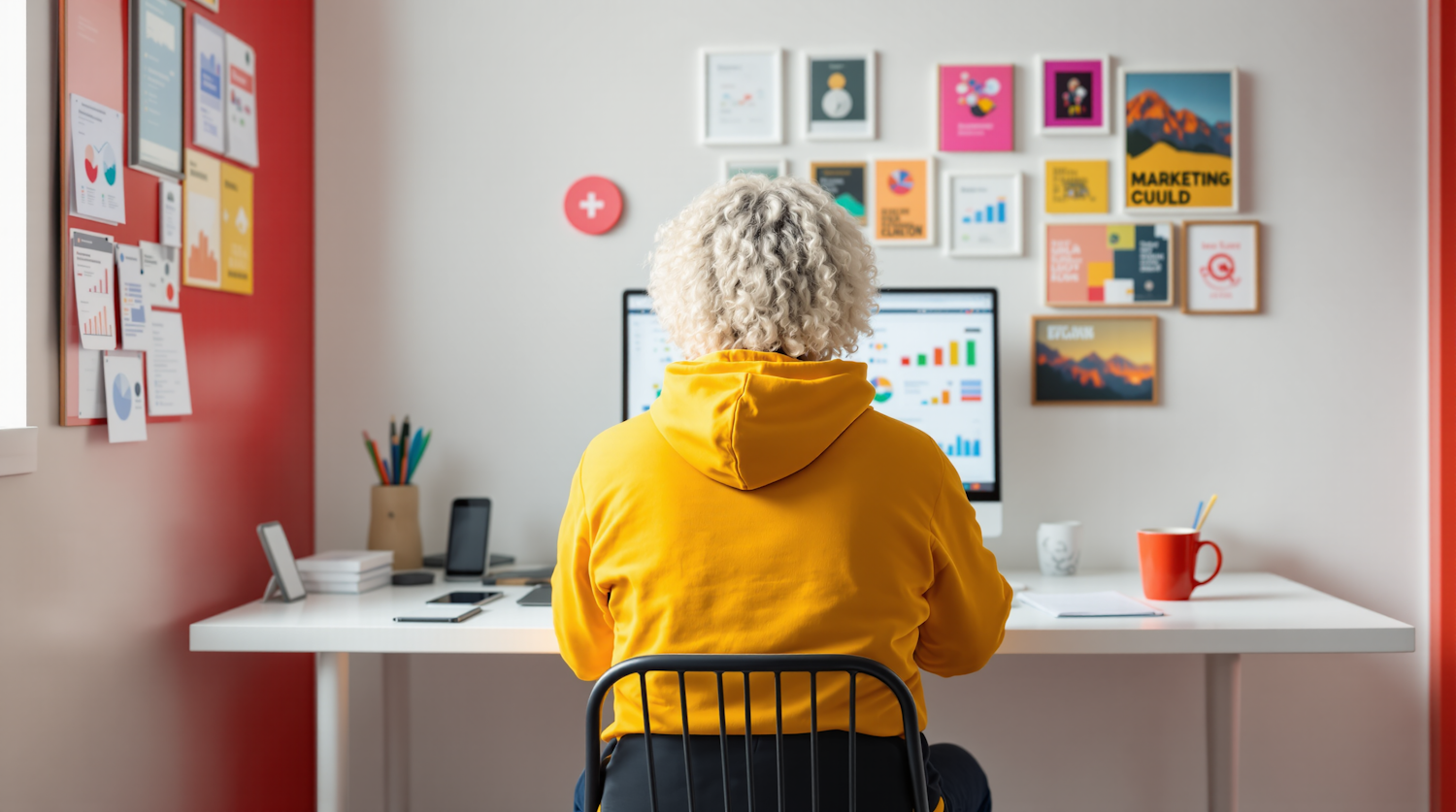 A person in a yellow hoodie works at a desk with a computer, surrounded by colorful charts and posters in a modern office.