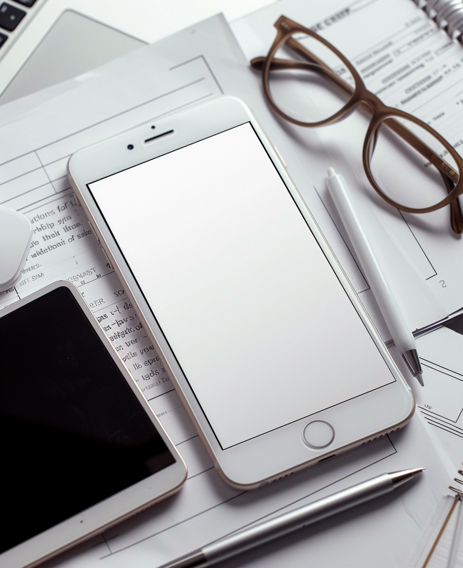 Organized workspace with a smartphone, tablet, glasses, and pens on documents, suggesting a professional setting.