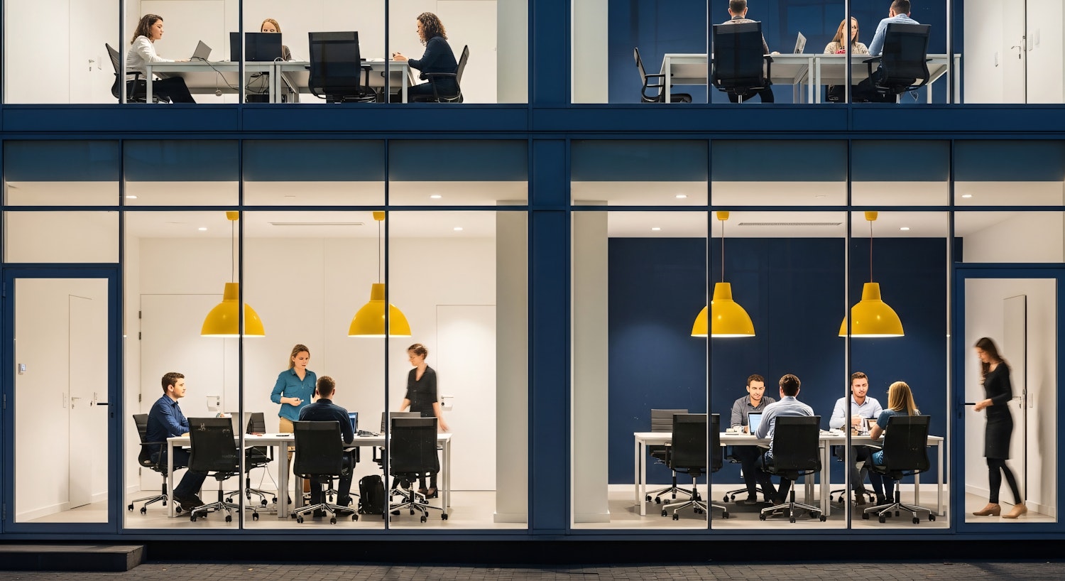 Modern office building with glass windows, showcasing collaborative workspaces and a meeting room with vibrant yellow lighting.
