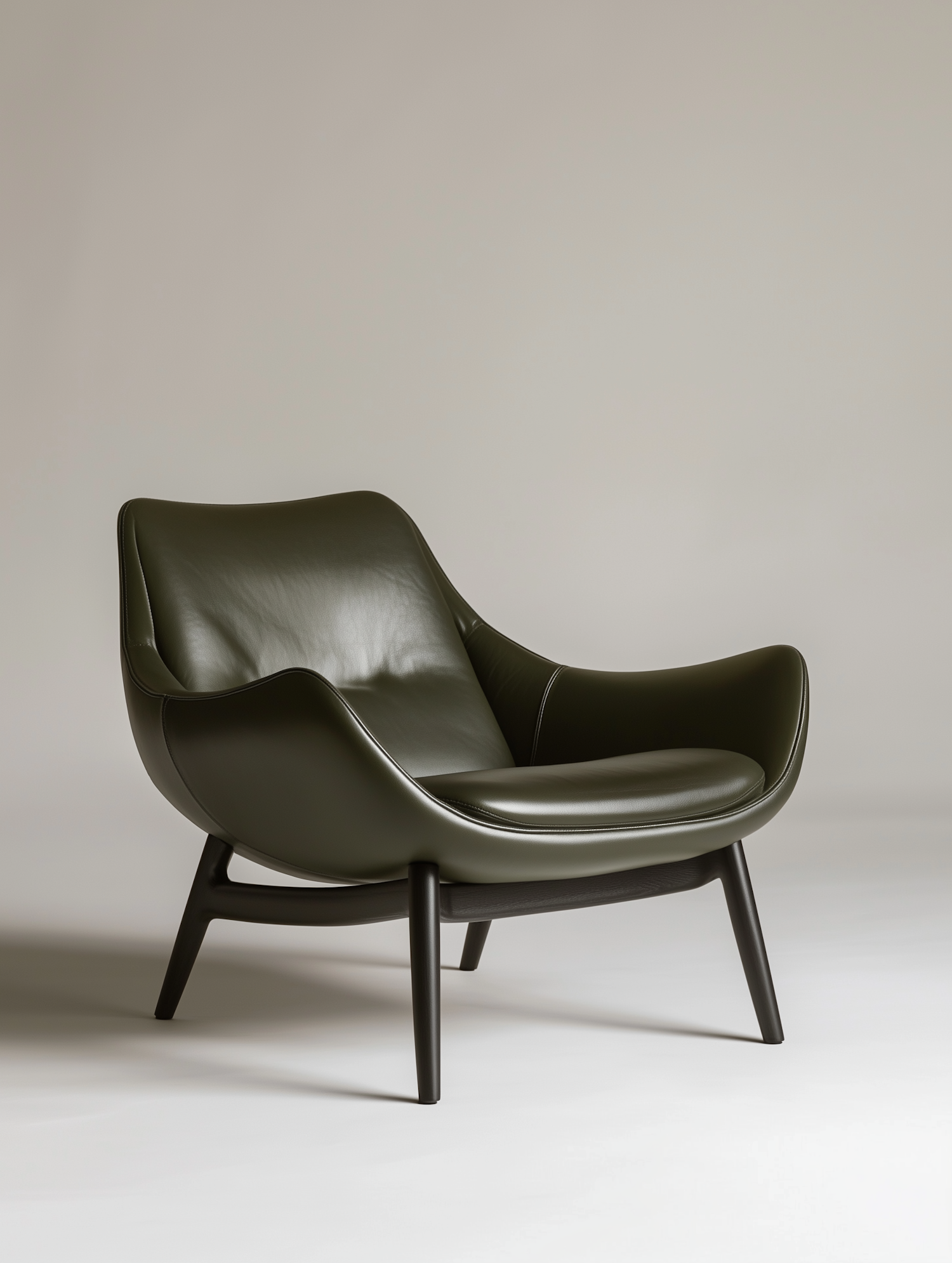Modern olive-green leather armchair with curved design and black wooden legs, perfect for contemporary interiors.