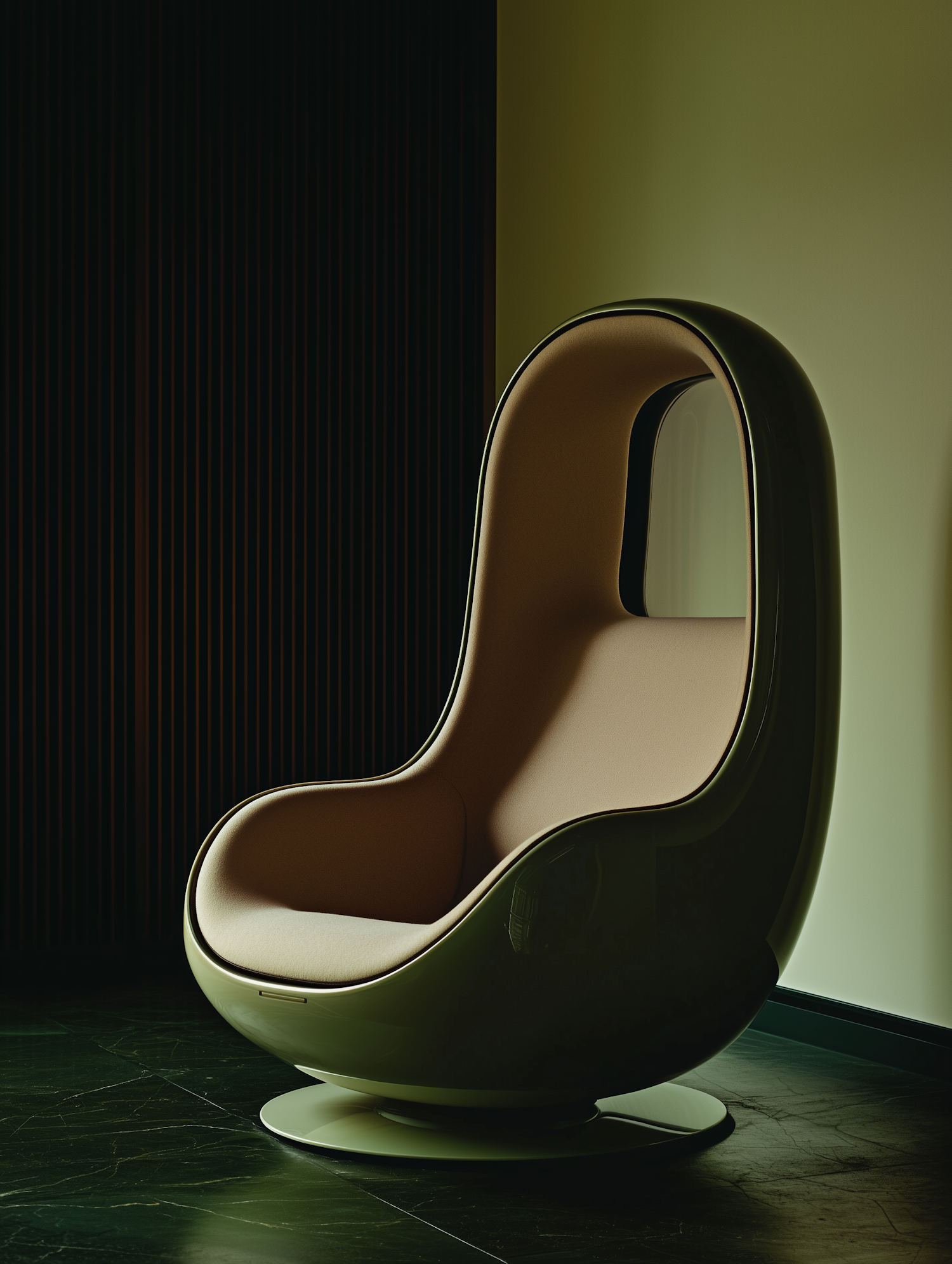 Futuristic olive green chair with a sleek, egg-shaped design and beige interior in a dimly lit room with textured walls.