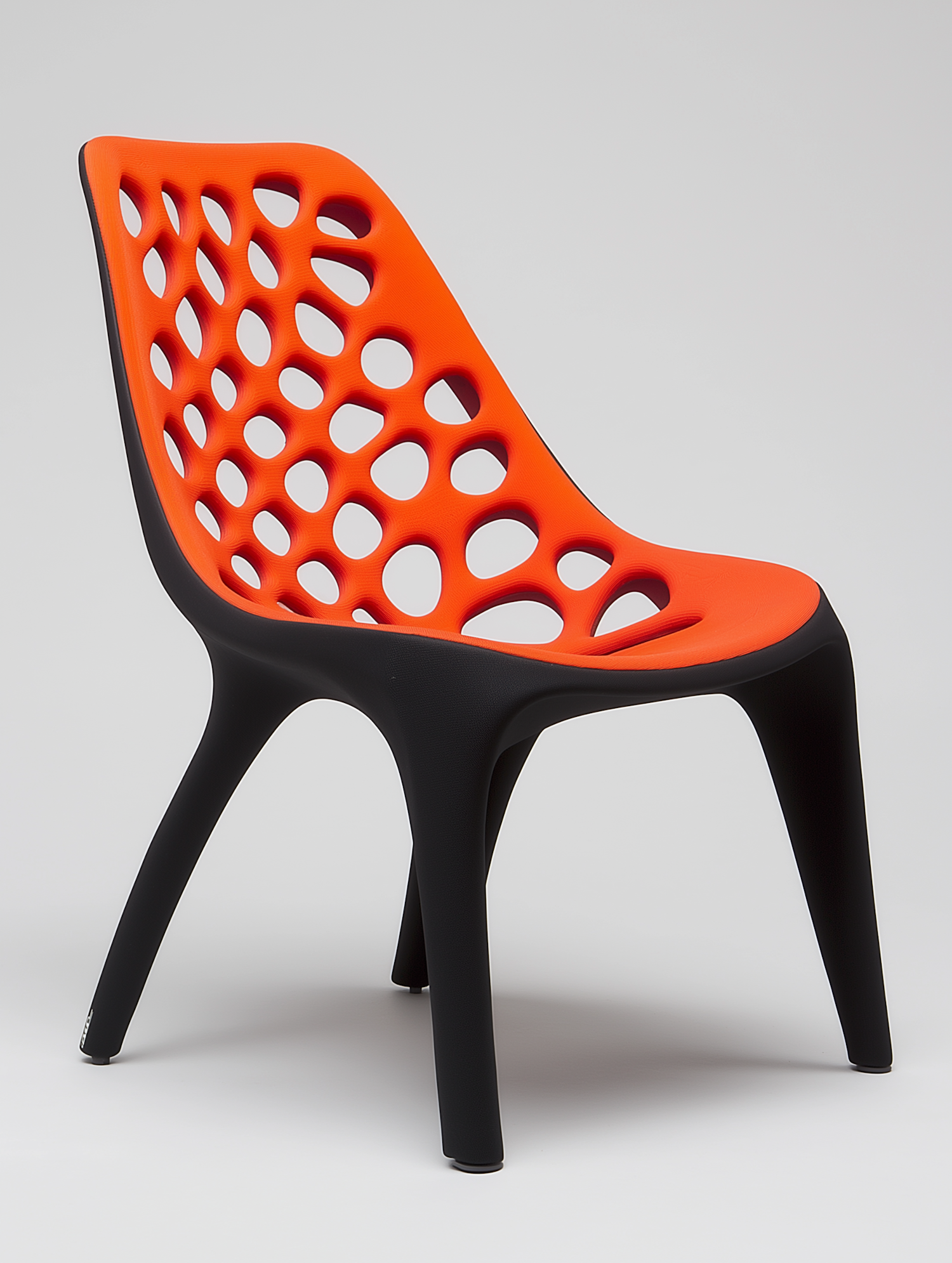 Modern orange and black chair with a perforated honeycomb design, ergonomic shape, and sturdy angled legs for contemporary interiors.