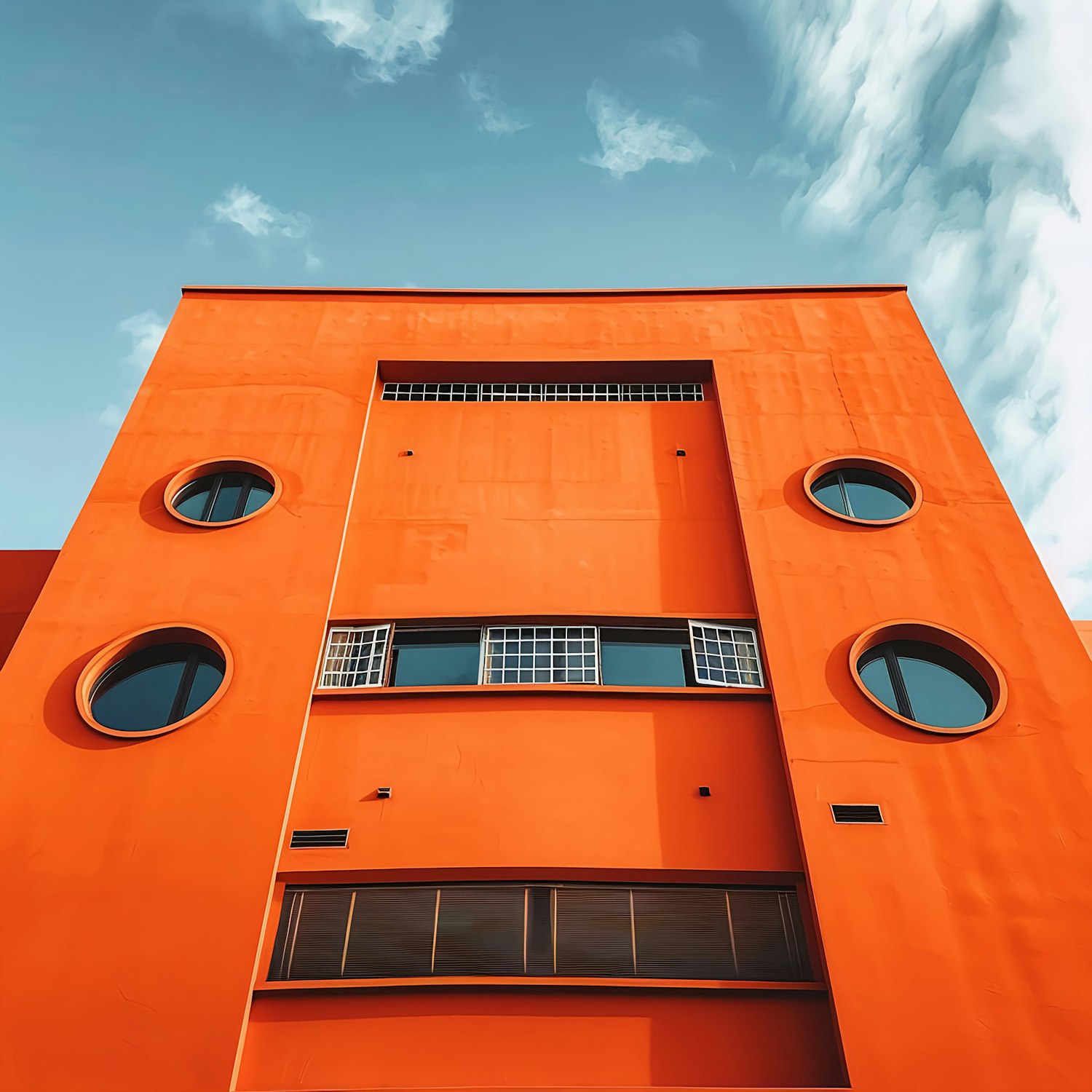 Vibrant orange building with circular windows against a clear blue sky, showcasing modern architectural design.