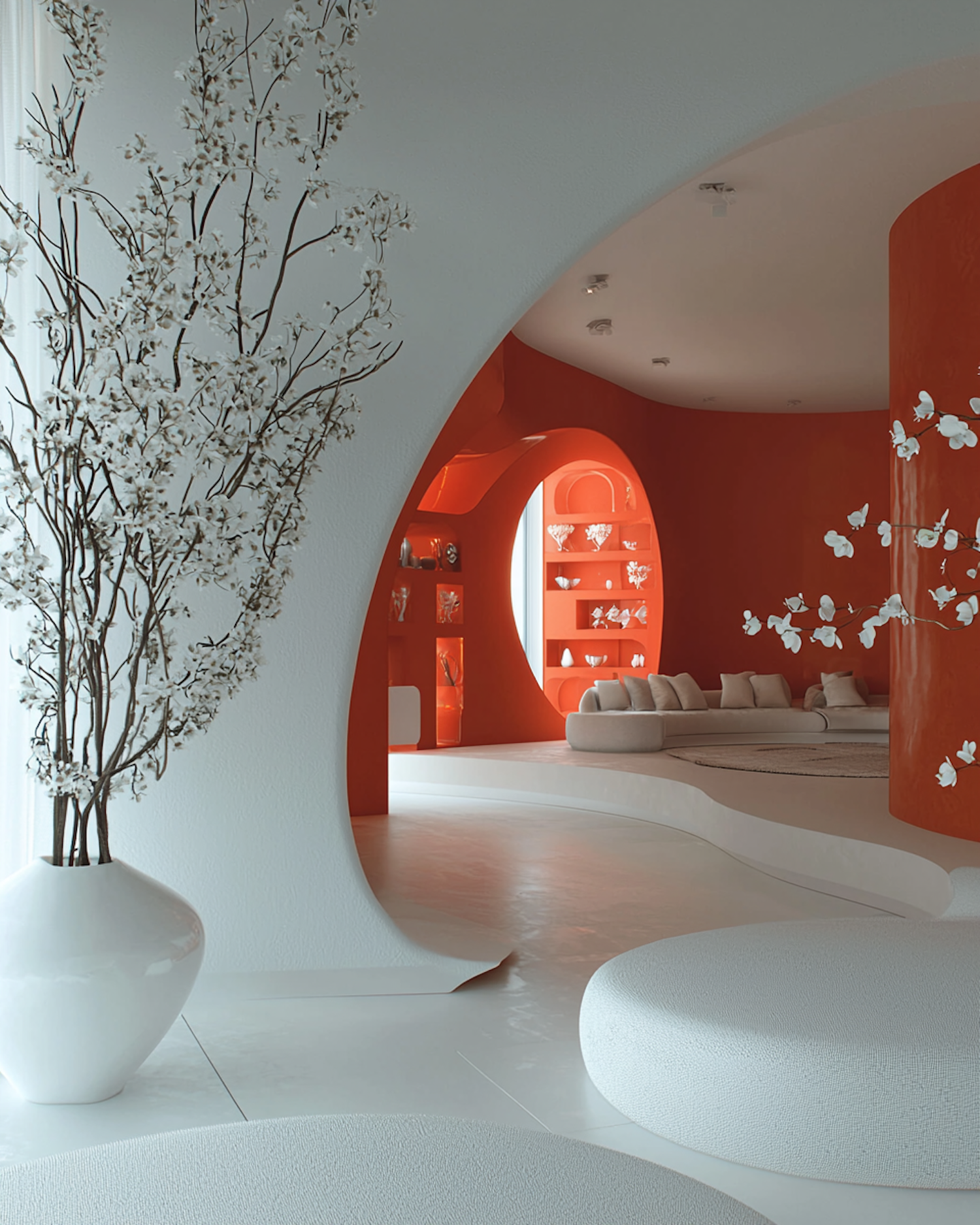 Modern interior with bold orange walls, white minimalist furniture, and organic shapes. A vase with blossoms adds a natural touch.