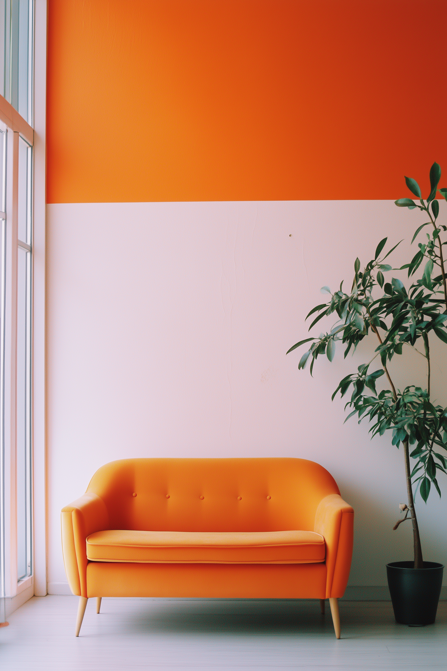 Bright orange sofa against a two-tone orange and white wall, paired with a green potted plant in a modern, minimalistic interior.