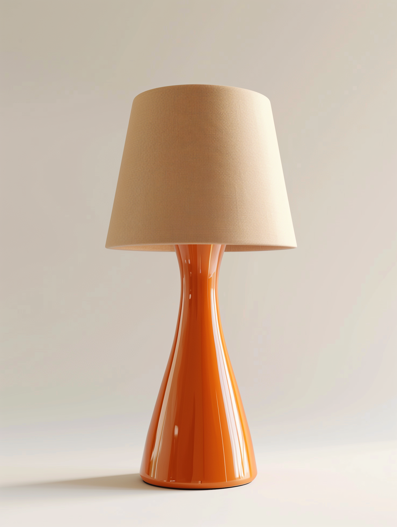 Sleek orange table lamp with a curvy base and beige fabric shade, perfect for adding a pop of color to modern interiors.