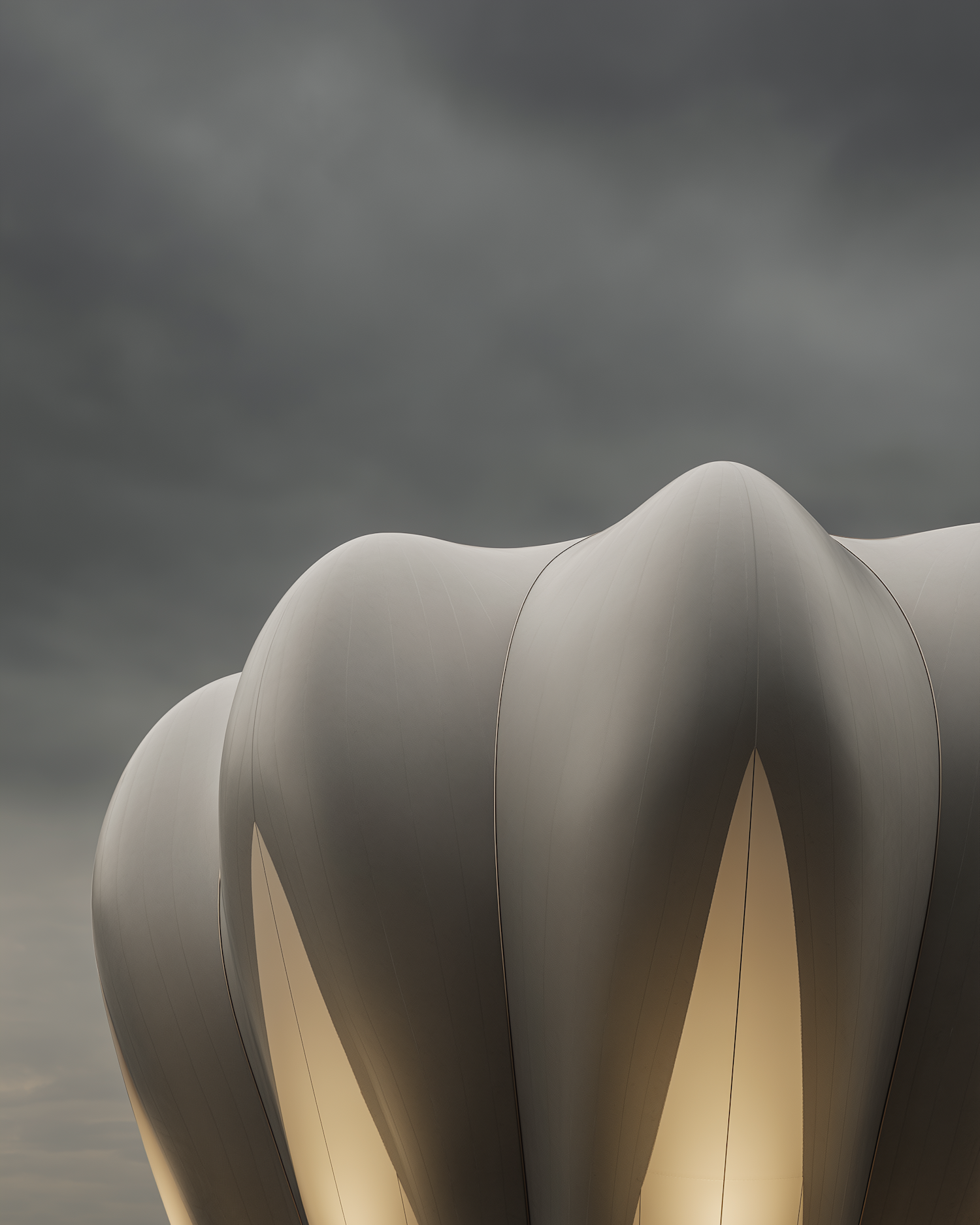 A modern architectural structure with smooth, petal-like forms glowing warmly against a dramatic cloudy sky.