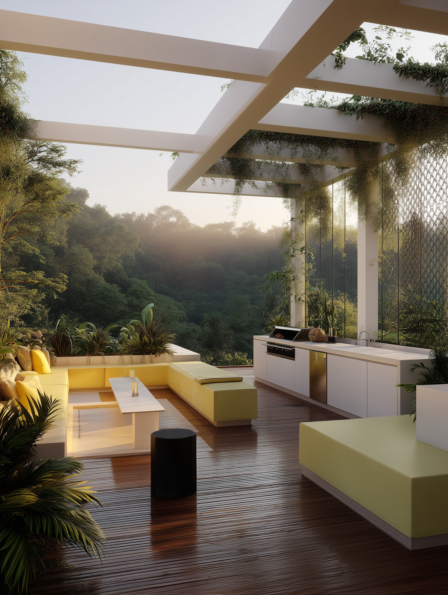 Modern outdoor patio with yellow seating, white pergola, lush greenery, and a sleek outdoor kitchen. Perfect for relaxing in nature.