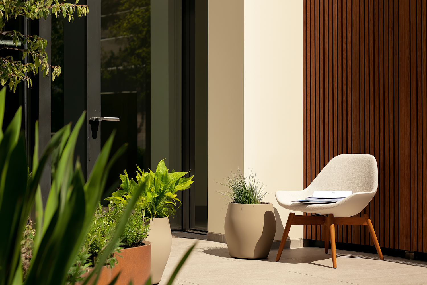 Modern patio with a white chair, wooden accents, lush green plants, and sleek black-framed glass door. Perfect for relaxing outdoors.