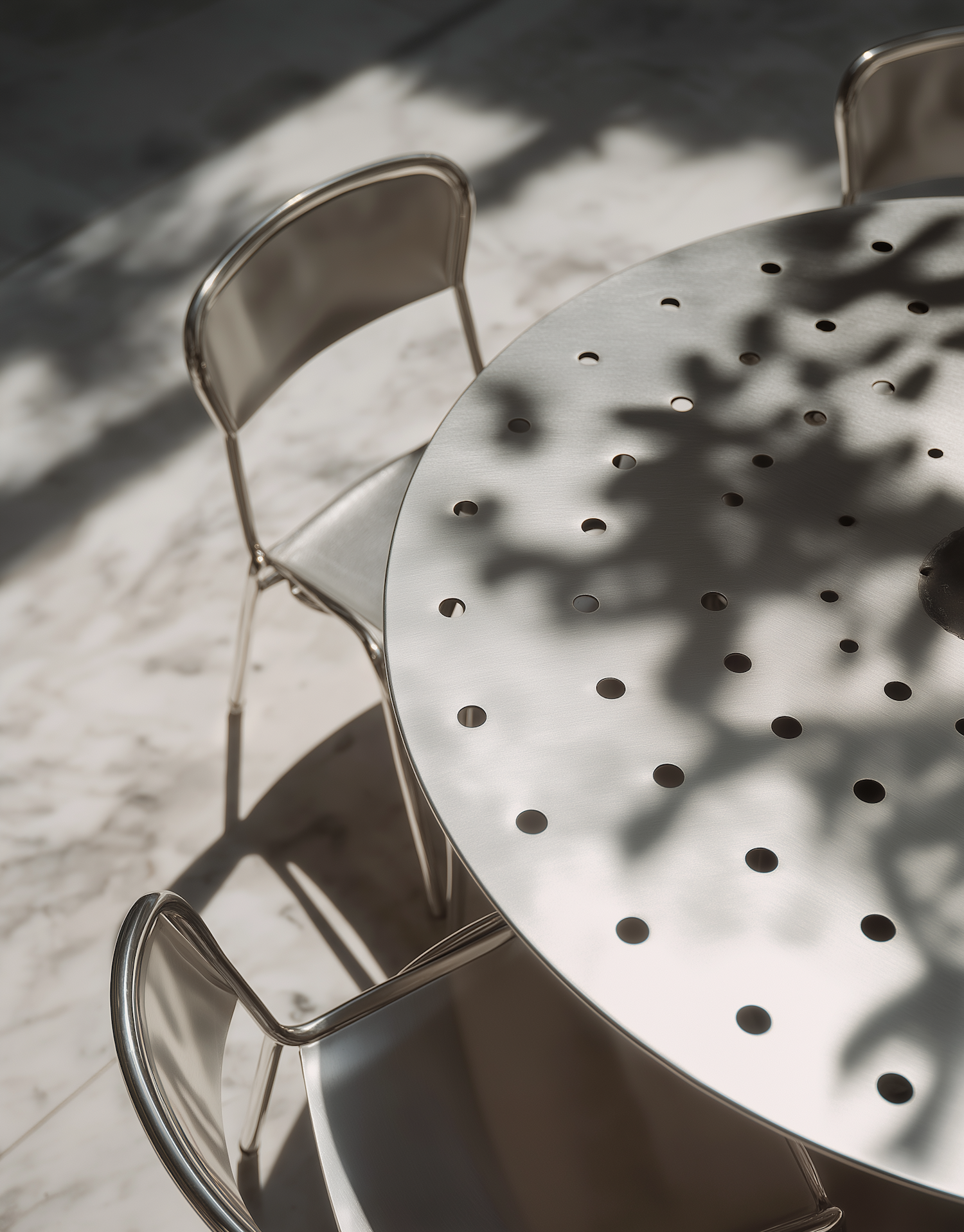Stylish metallic table and chairs on a marble floor, with sunlight casting intricate shadows of foliage for a modern outdoor vibe.