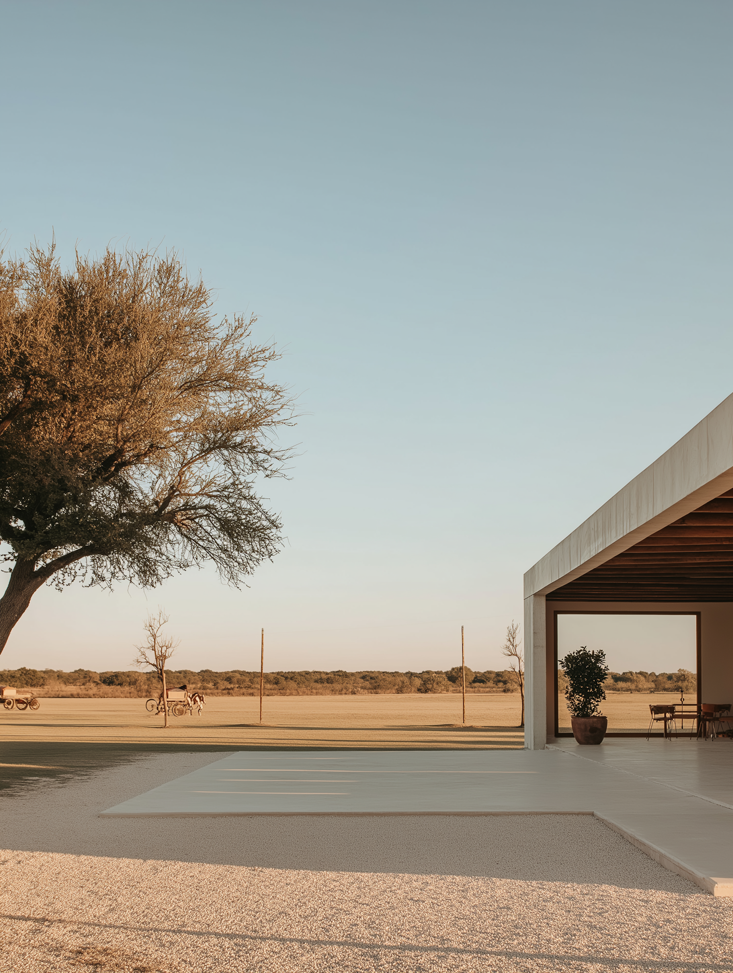 Modern open-air architecture with a tree, vast field, and horse-drawn carriage in the distance under a clear blue sky.