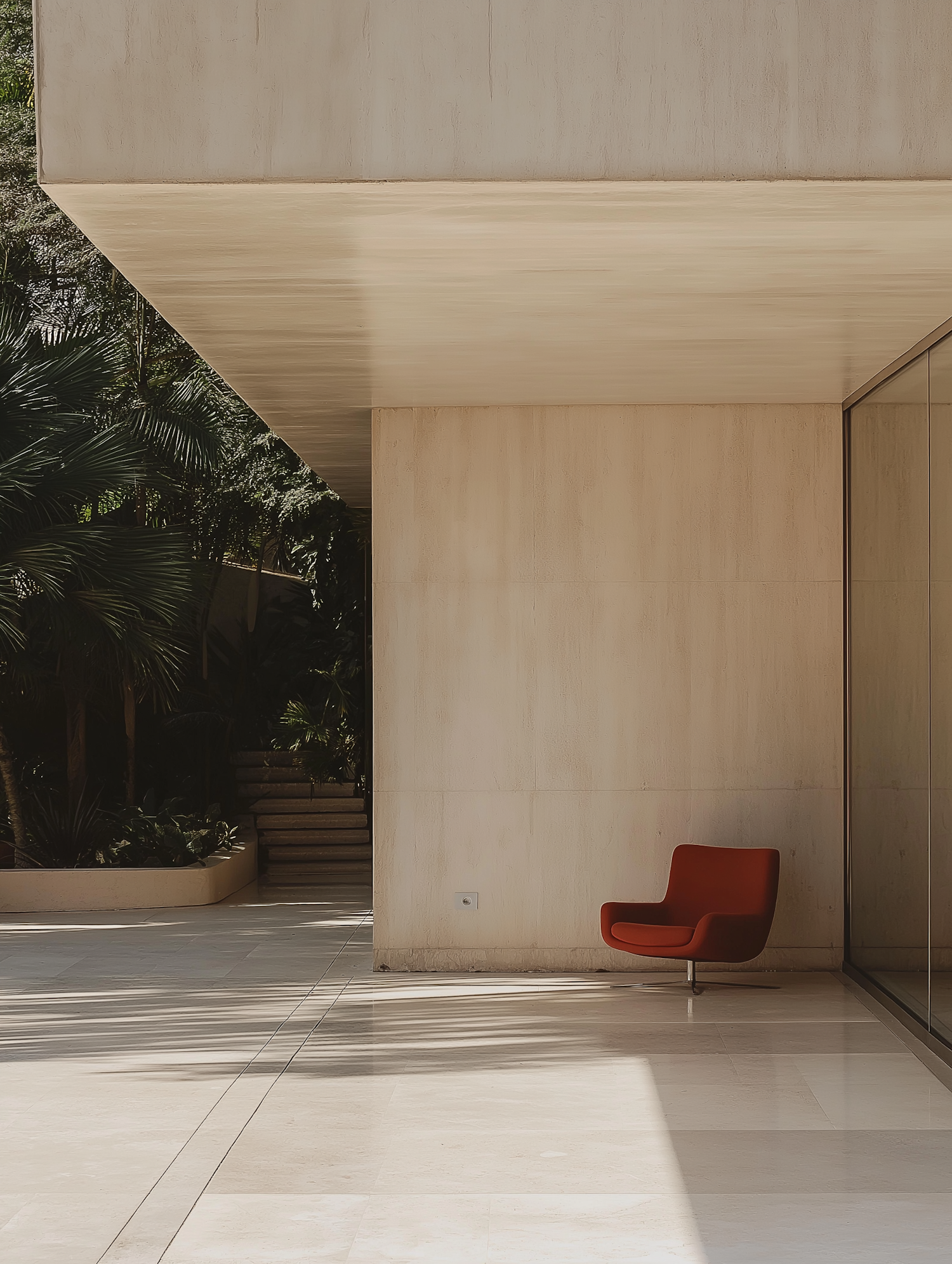 Minimalist outdoor space with a red chair, beige walls, polished tiles, and lush greenery. Modern design meets natural elements.
