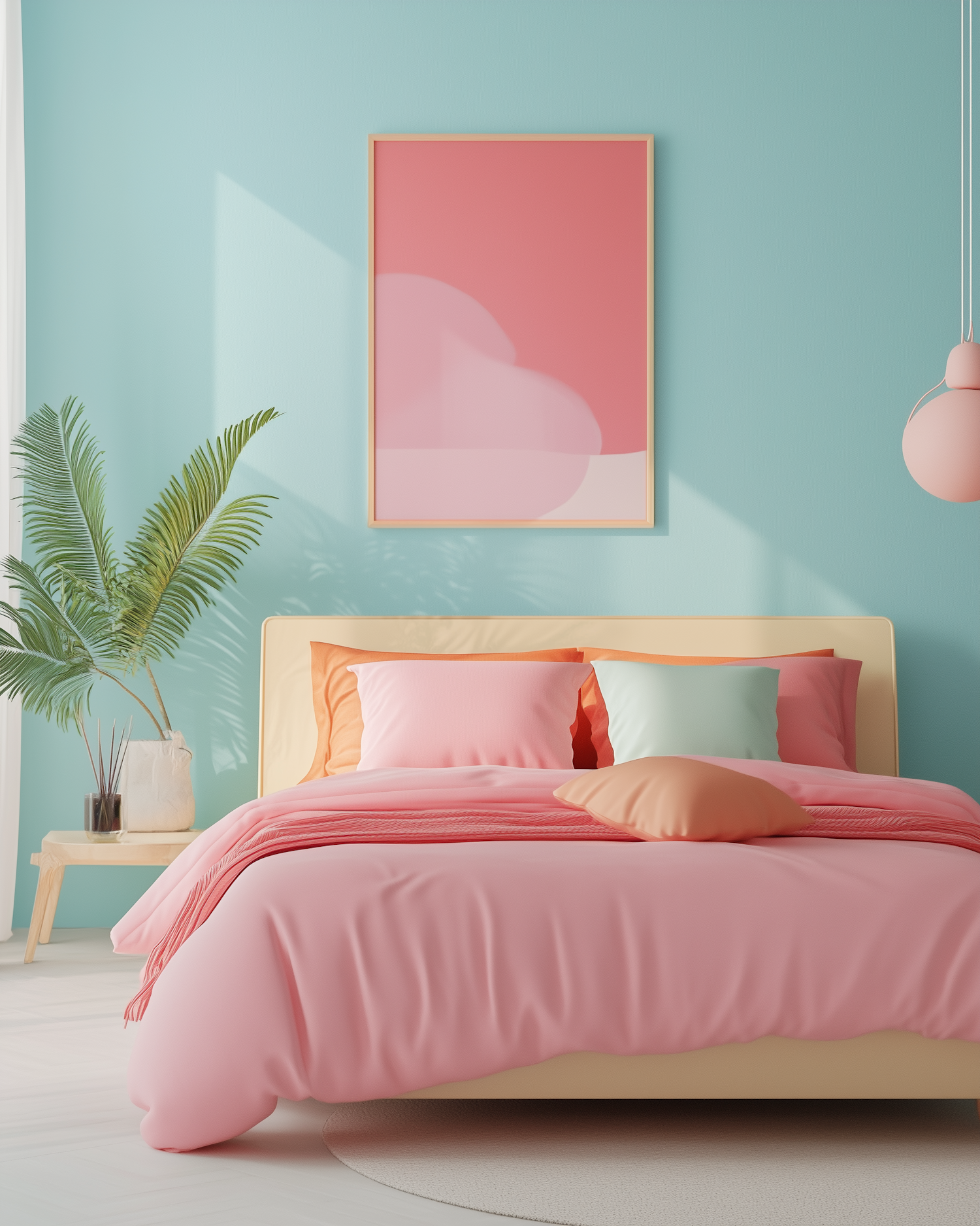 Bright pastel bedroom with pink bedding, mint green walls, and modern decor. Features a potted palm, abstract art, and soft lighting.